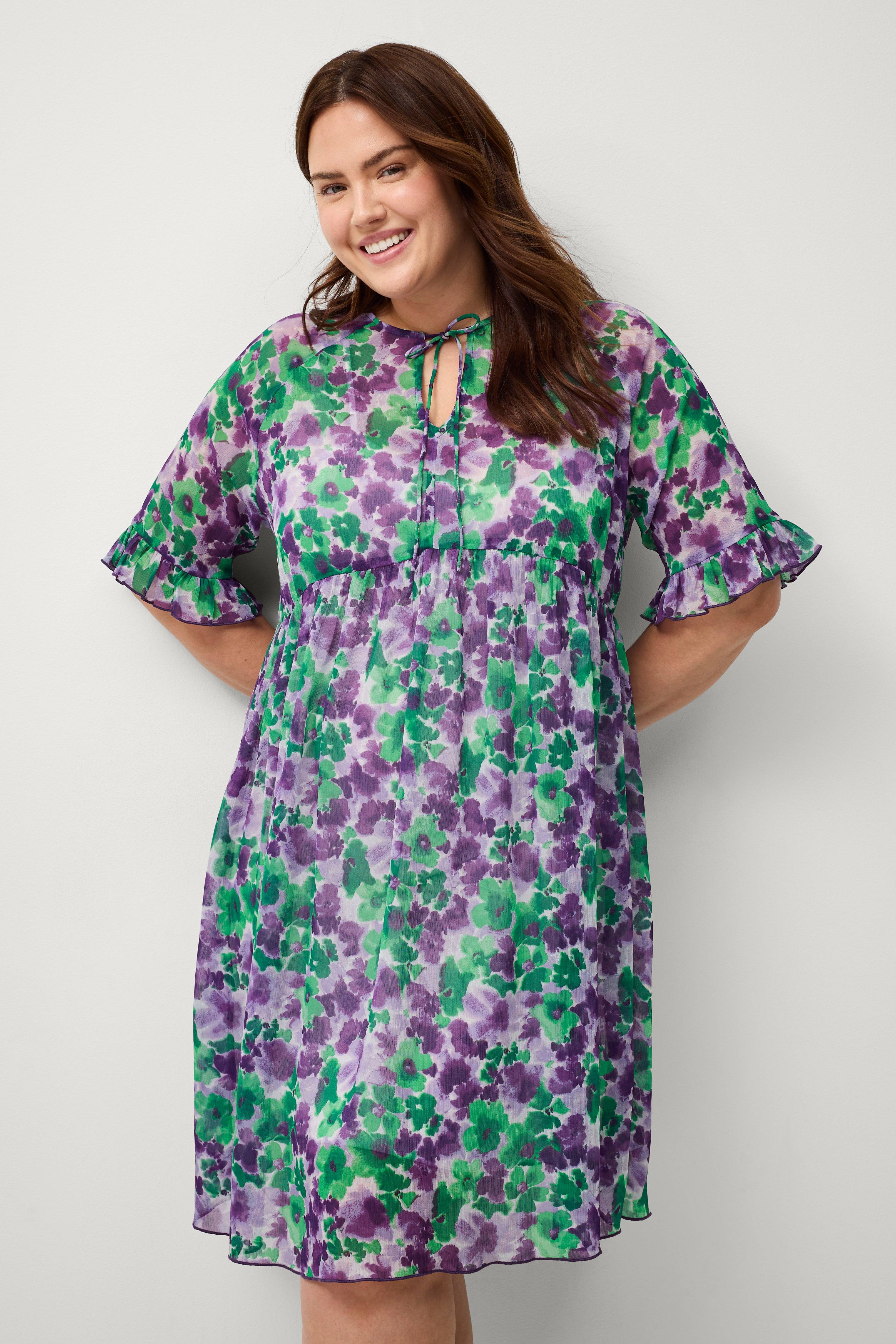 • Kjole i chiffon • Model med svaj • Halvlange ærmer med volant ved manchetterne • Underkjole med tynde skulderstropper • Længde: 104 cm i størrelse 46/48