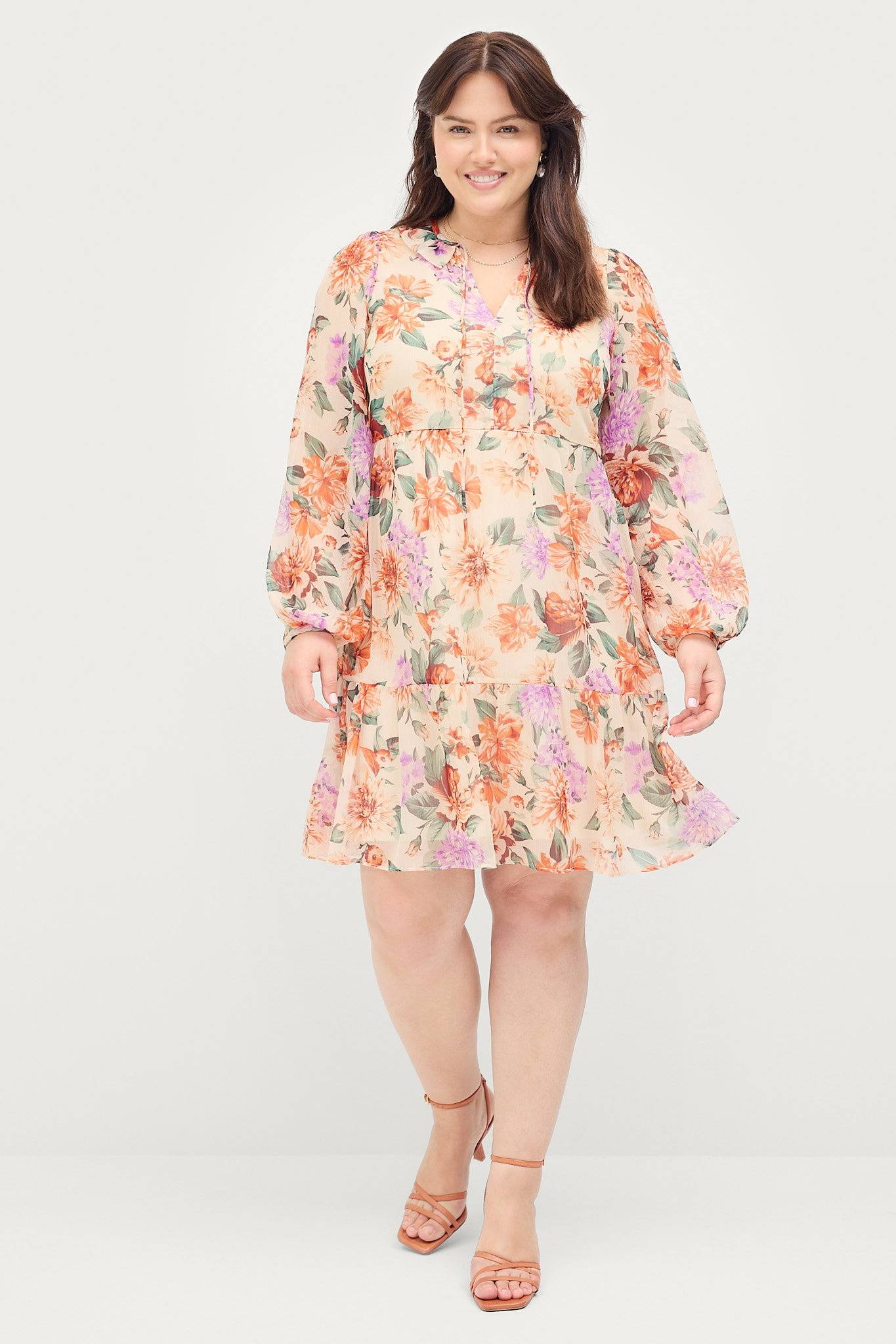 • V-formet halsudskæring med bindebånd foran og volant hele vejen rundt • Udskæring ved taljen • Volant ved nederste kant • Store størrelser • Længde: 101 cm i størrelse 42/44