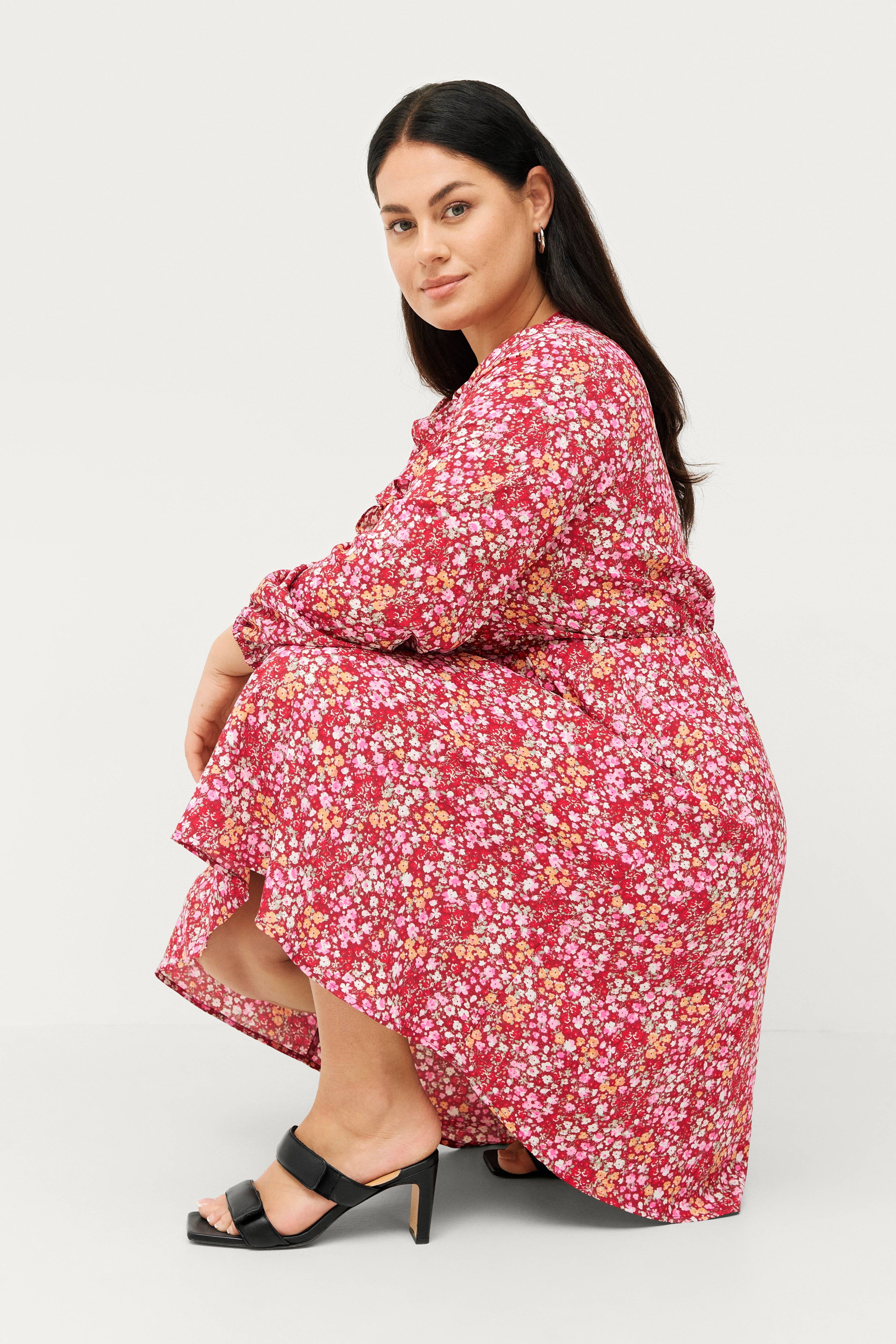 • V-udskæring med volant • Elastisk talje • Ballonærmer • Længde: 108 cm i størrelse 46/48 • Produktet indeholder genindvundet materiale, som genbruges for at reducere mængden af affald samtidigt med at der ikke anvendes nye ressourcer.