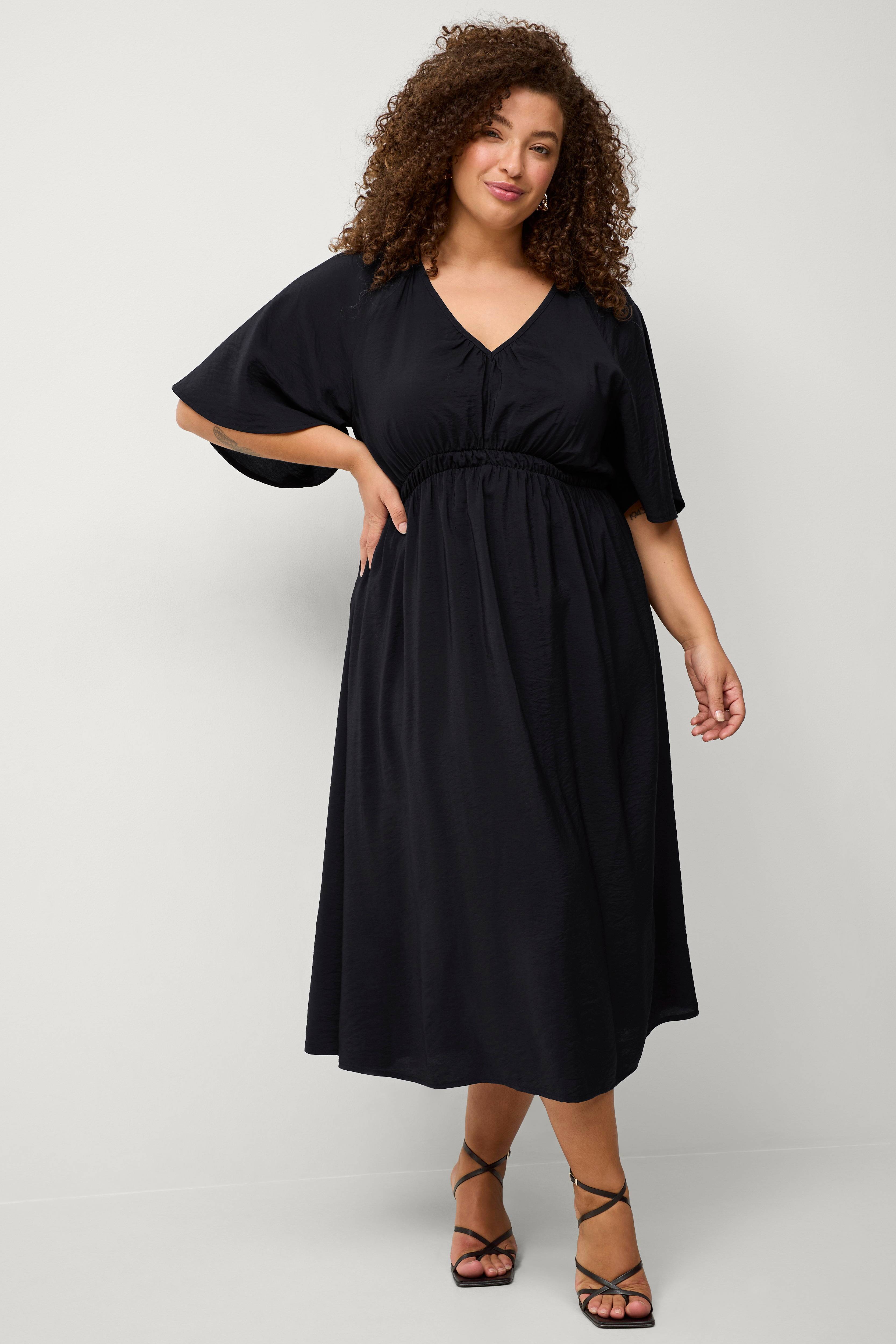 • V-udskæring• Elastisk talje• Brede ærmer• Behandlet materiale• Længde: 127 cm i størrelse 46/48