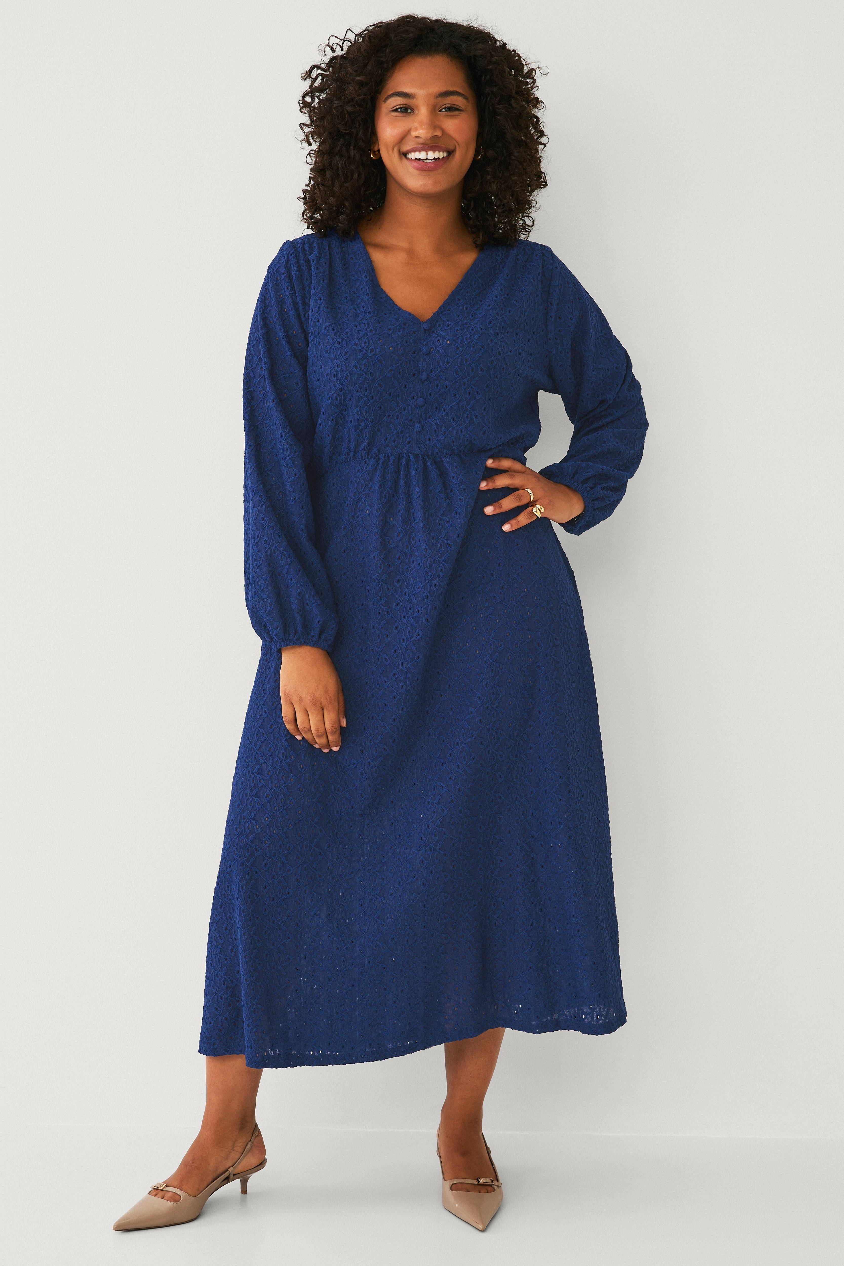 • Blød kjole med beklædte, dekorative knapper foran og hulbroderet mønster