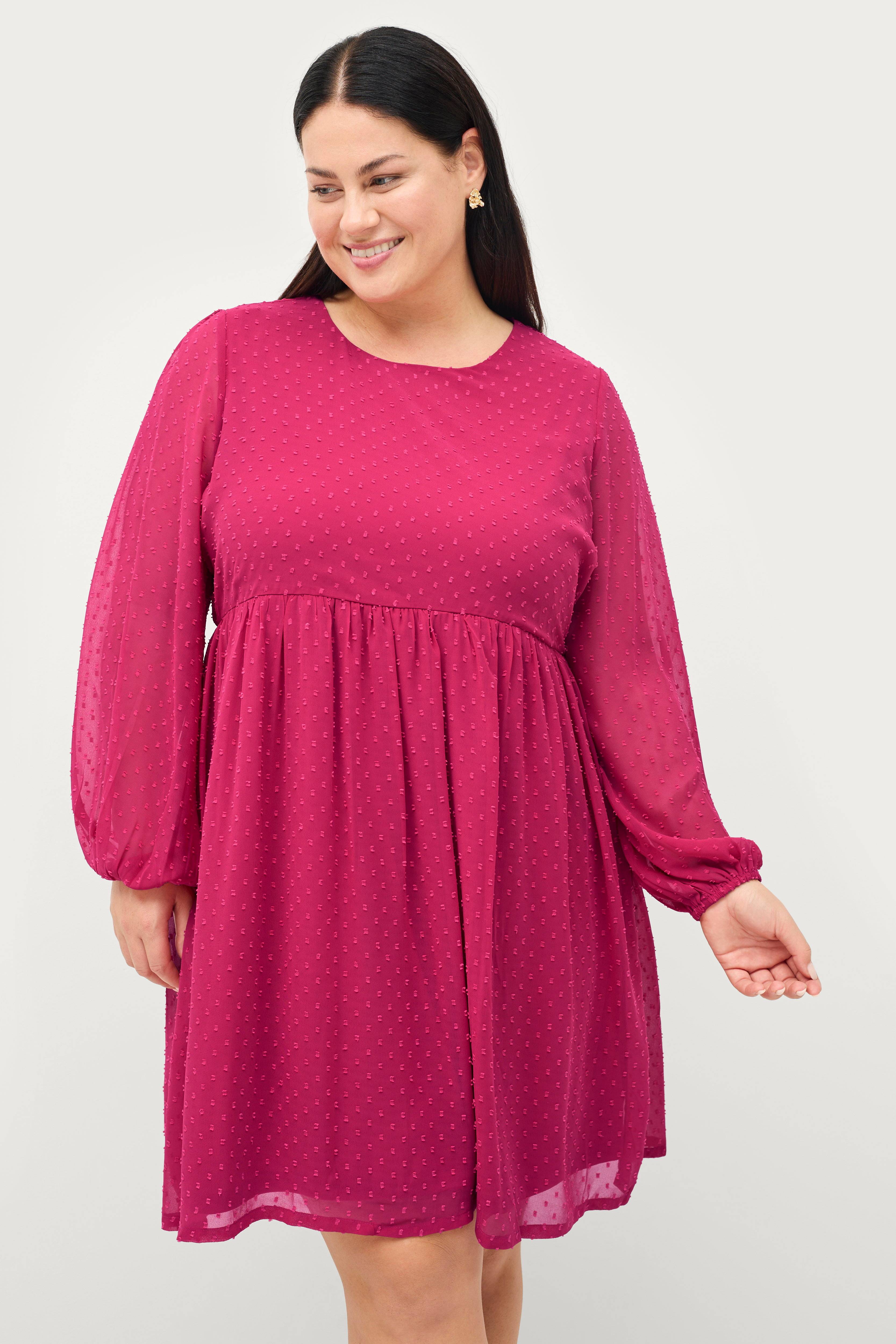 • Kjole i chiffon med strukturmønster • Elastisk talje • Ventilation med knap i nakken • Ballonærmer med elastiske manchetter • Trikotfor • Længde: 102 cm i størrelse 46/48