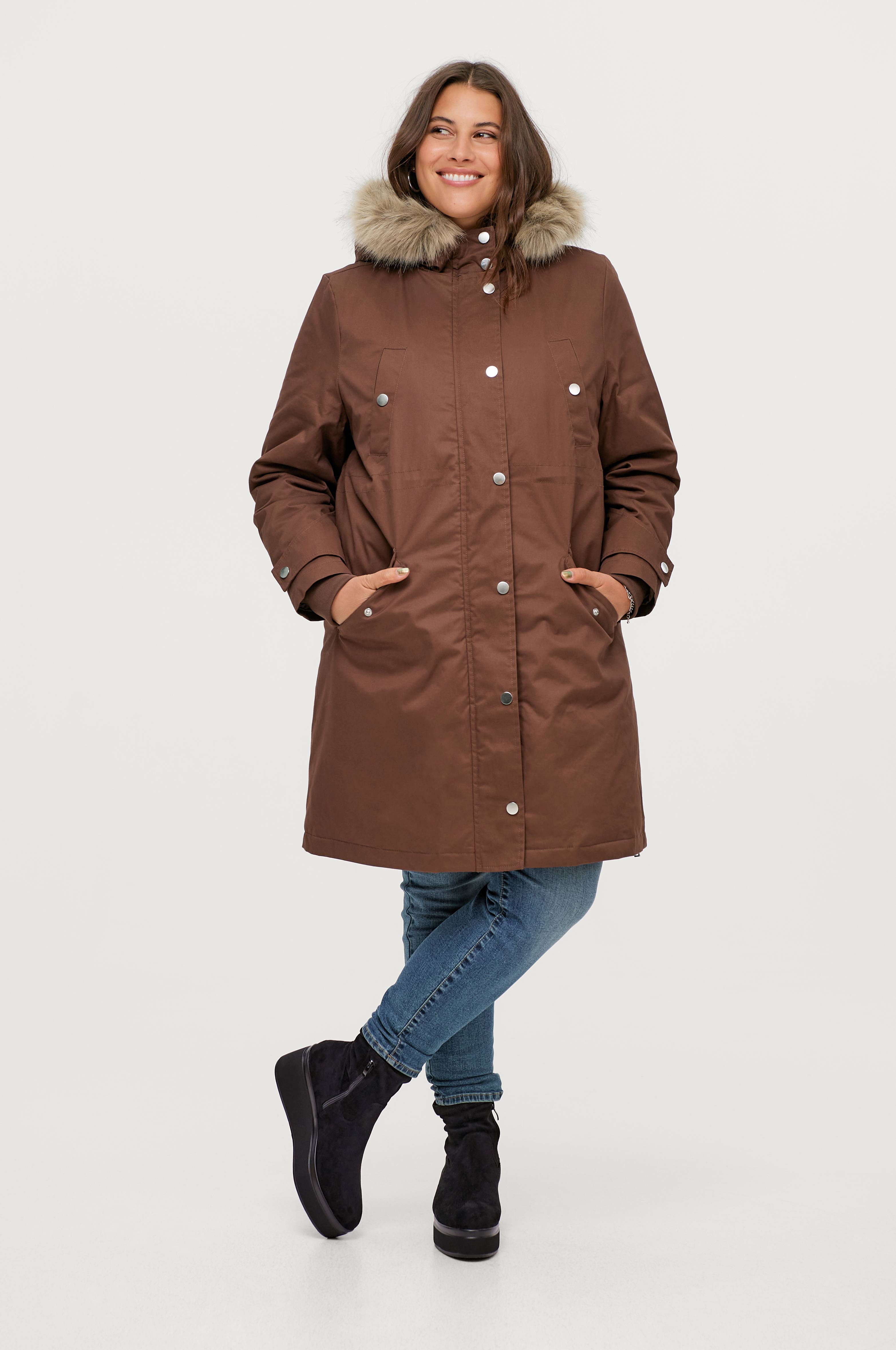 Parkacoat Cajsa i mellemlang, vatteret model. Fast, justerbar hætte med blødt plysfor. Hætten har en aftagelig kant af kunstpels. Høj krave som kan lukkes med to trykknapper. Lukkes med 2-vejs lynlås under overfald med trykknapper. I alt fire forlommer med trykknaplukning. Indvendig, justerbar løbegang i taljen og lynlåse i siderne forneden. Ribkant samt trykknap i ærmekanten. Blødt plysfor foroven og i hætten, vævet, vævet, quiltet for i øvrige dele. Længde bagpå ca. 94 cm i str. 44.