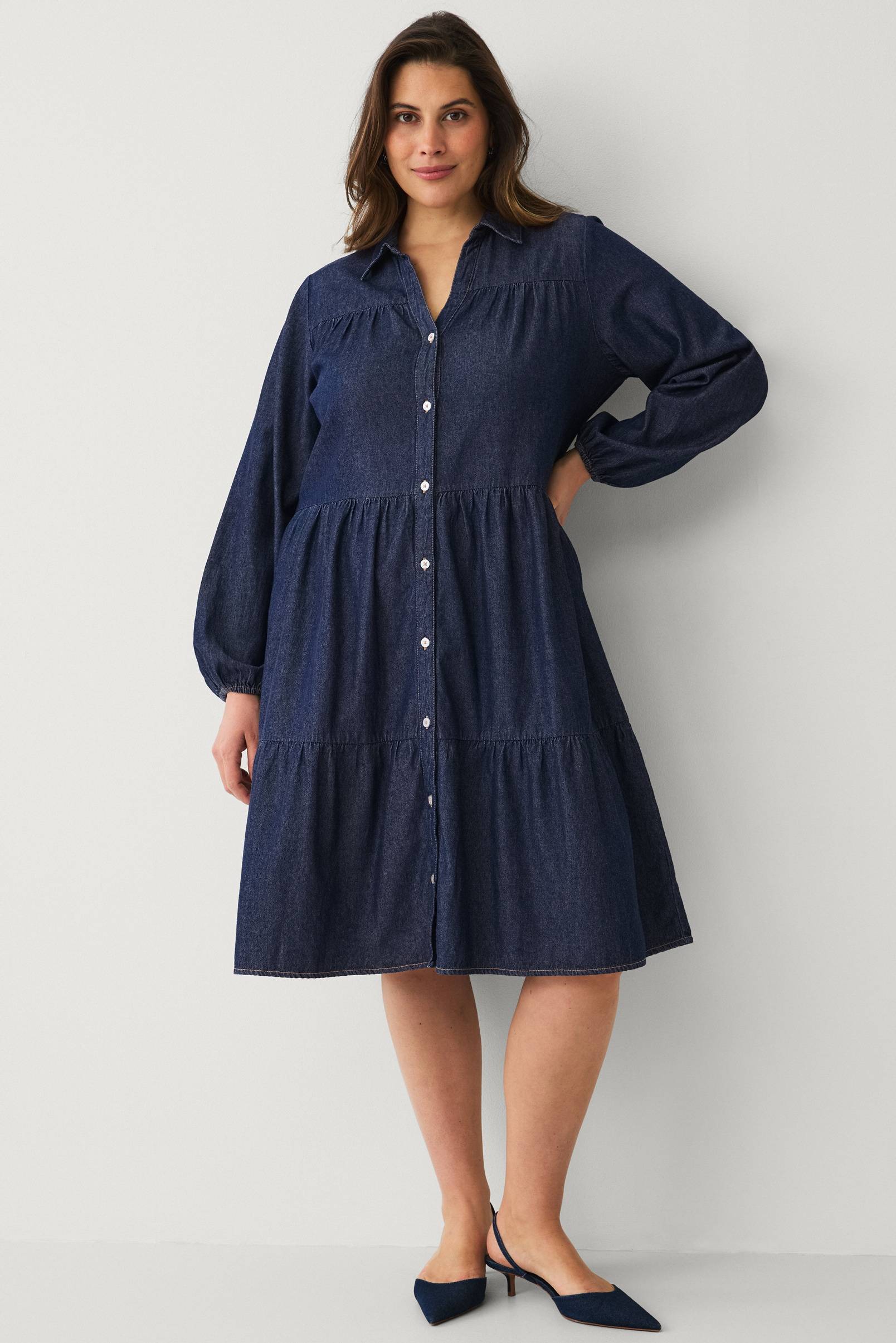 • Skjortekjole i blødt denim • Krave med slids foran • Lange ballonærmer • Knaplukning • Volanter nederst • Normal pasform • Længde: 110 cm i størrelse XL