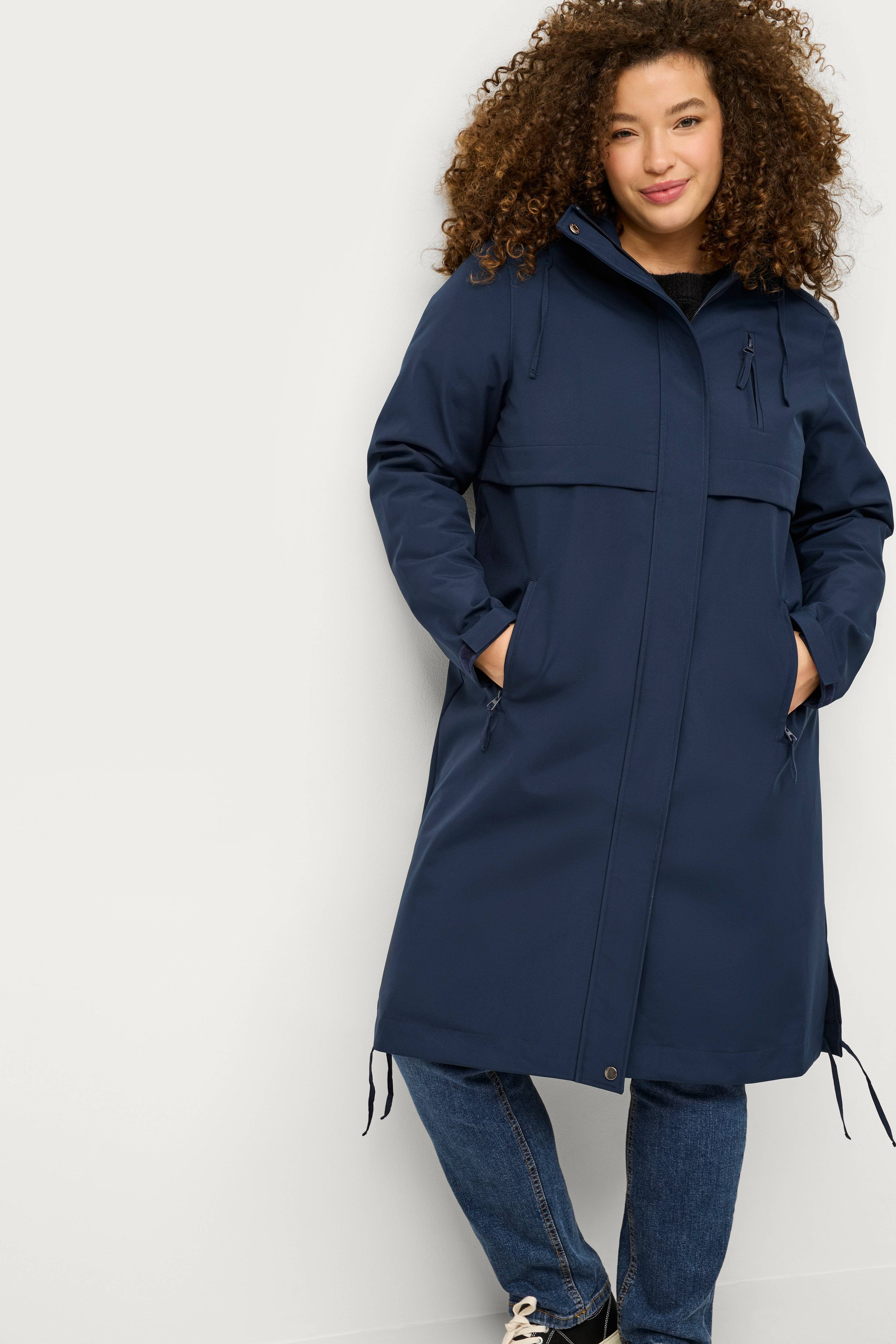 • Store størrelser • Skjult to-vejs lynlås med trykknapper • Tre lynlåslommer • Hætte med træksnørre • Justérbare ærmeafslutninger med velcrostrop • Træksnørre ved nederste kant • Længde: 116 cm i størrelse 46/48
