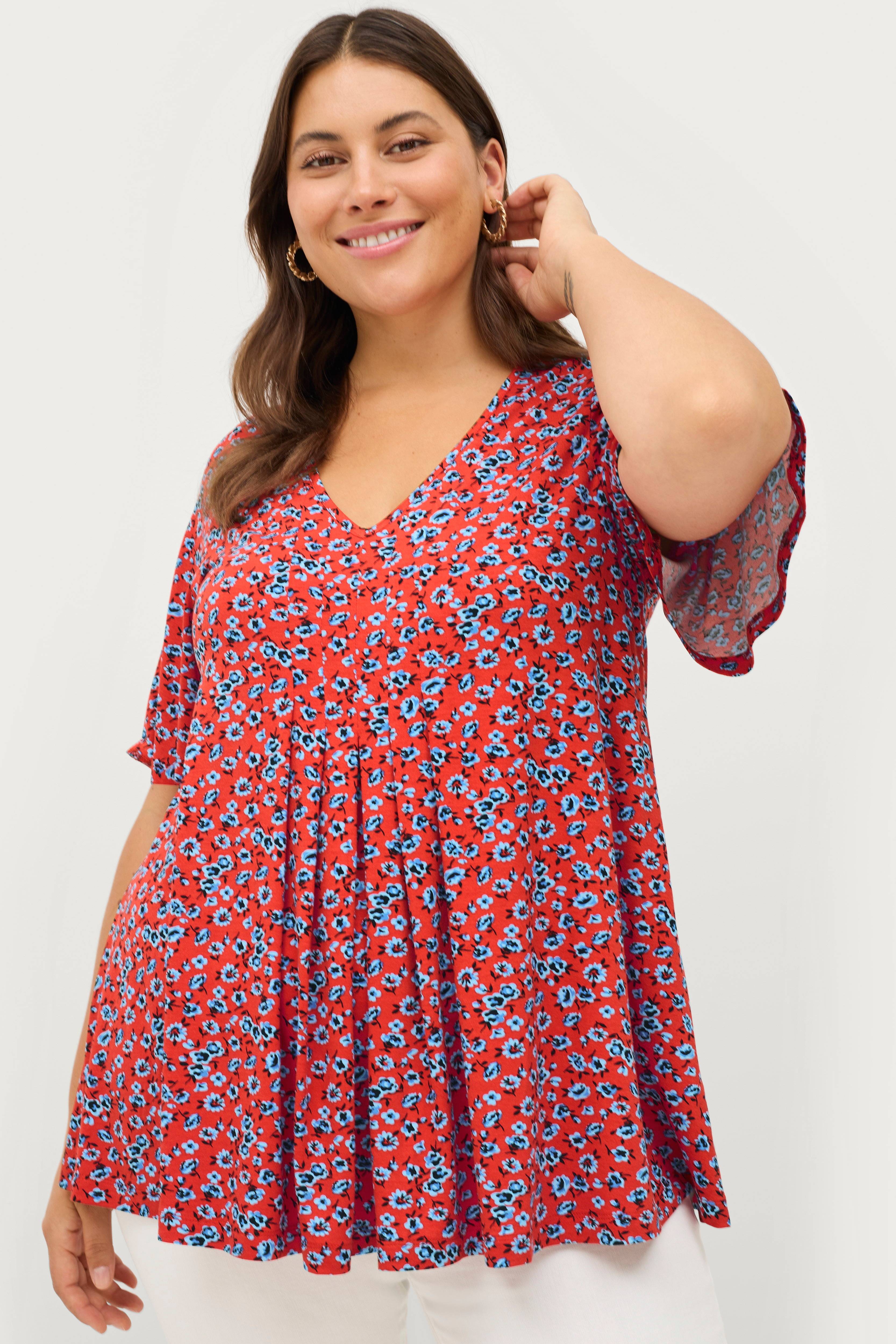 • Model med svaj• Dyb v-udskæring• Korte, brede ærmer• Lægge ved taljen• Fremstillet af viskosejersey