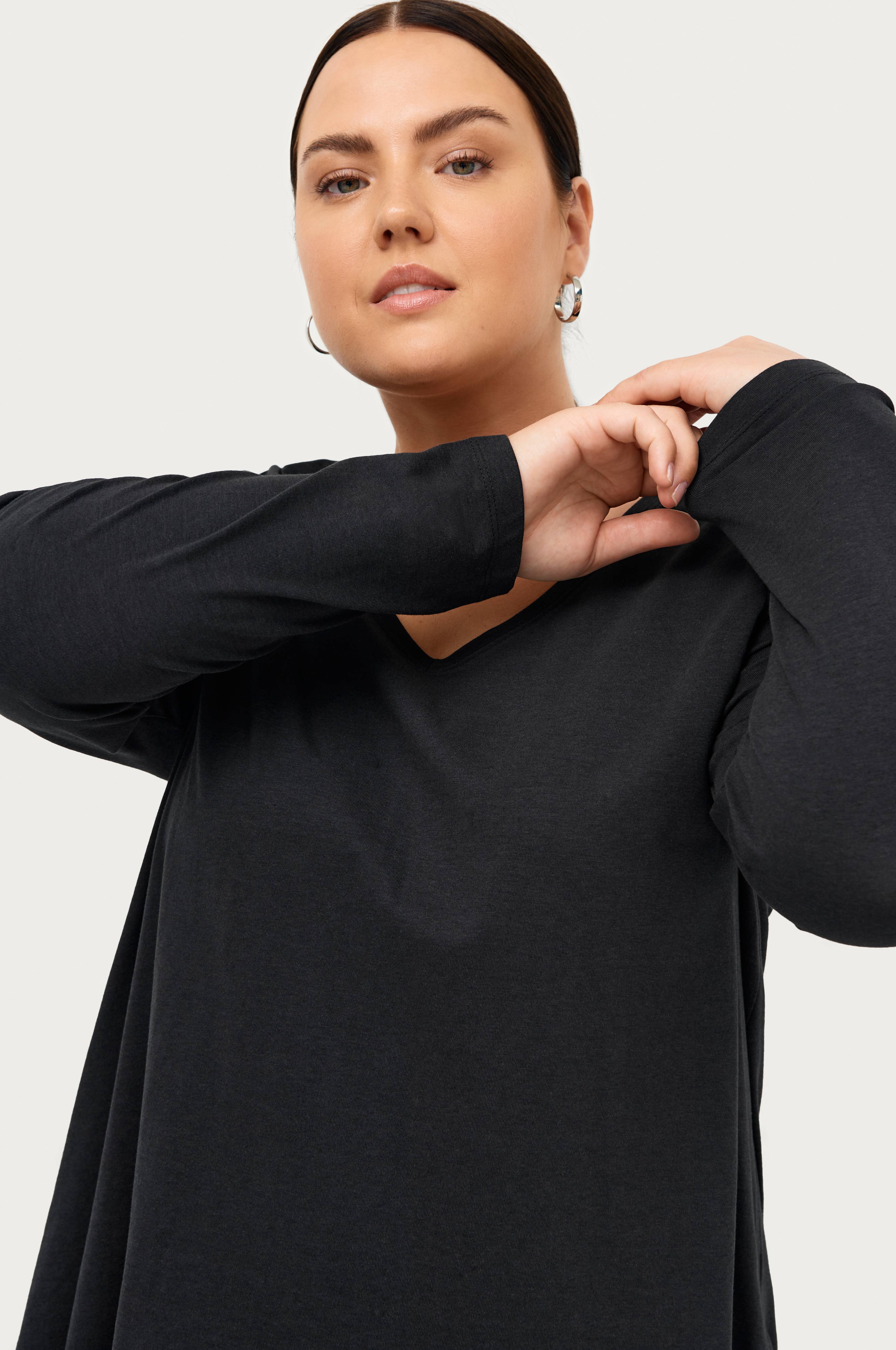 Top Hedwig i langærmet model med V-udskæring med ribkant foran. I blød jersey. Længde bagpå ca. 74 cm i str. 46/48.