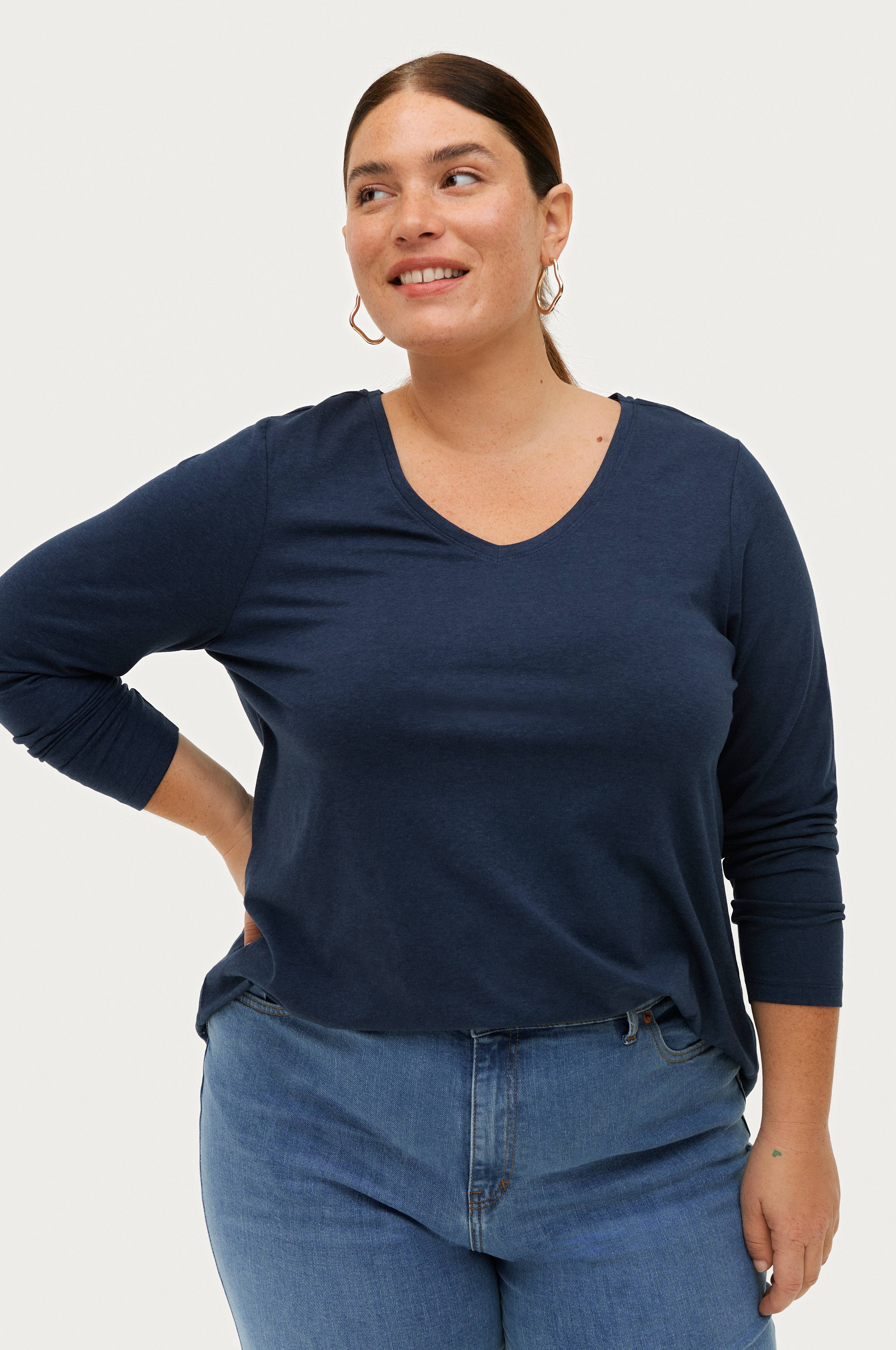 Top Hedwig i langærmet model med V-udskæring med ribkant foran. I blød jersey. Længde bagpå ca. 74 cm i str. 46/48.