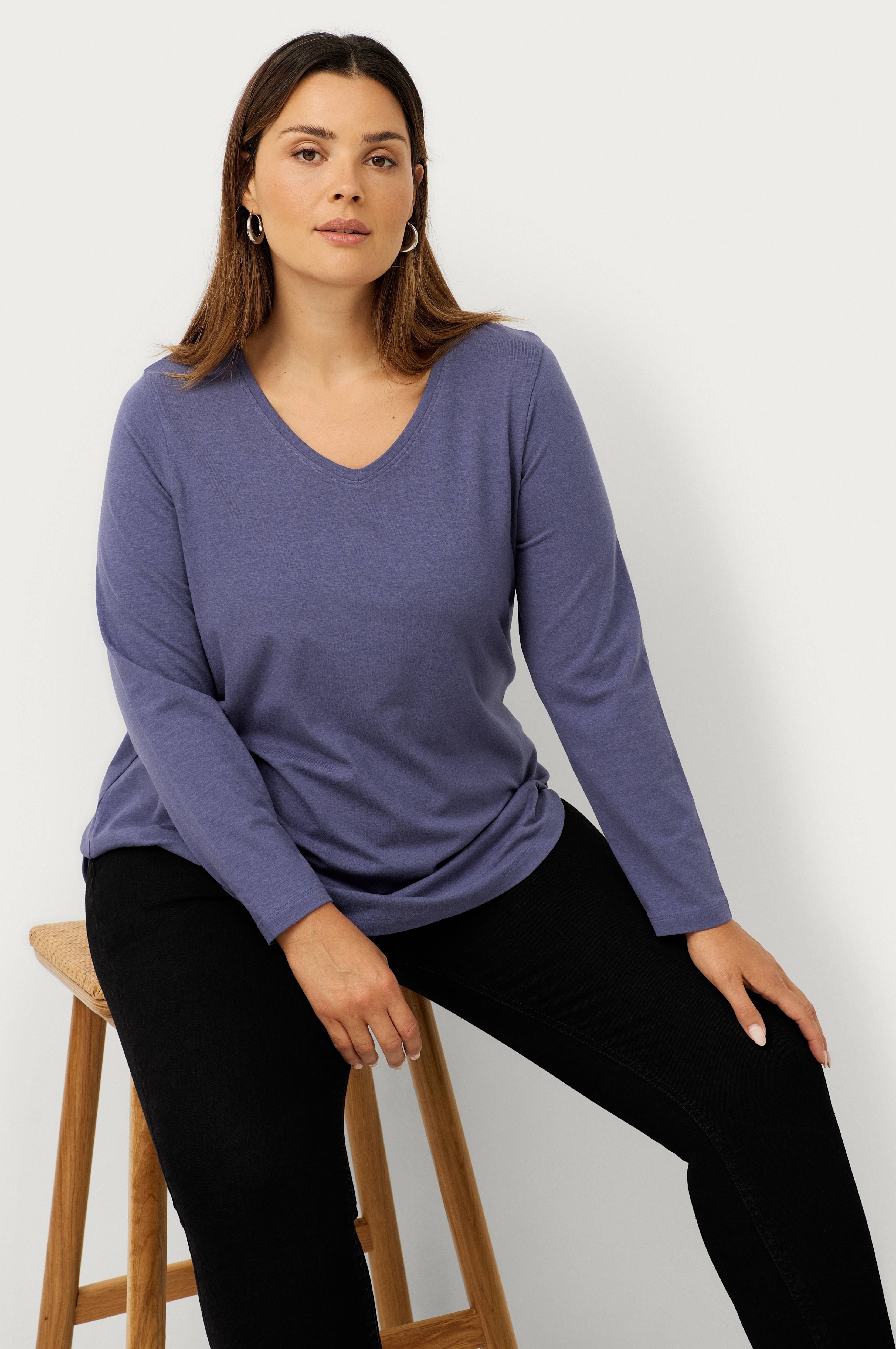 Top Hedwig i langærmet model med V-udskæring med ribkant foran. I blød jersey. Længde bagpå ca. 74 cm i str. 46/48.