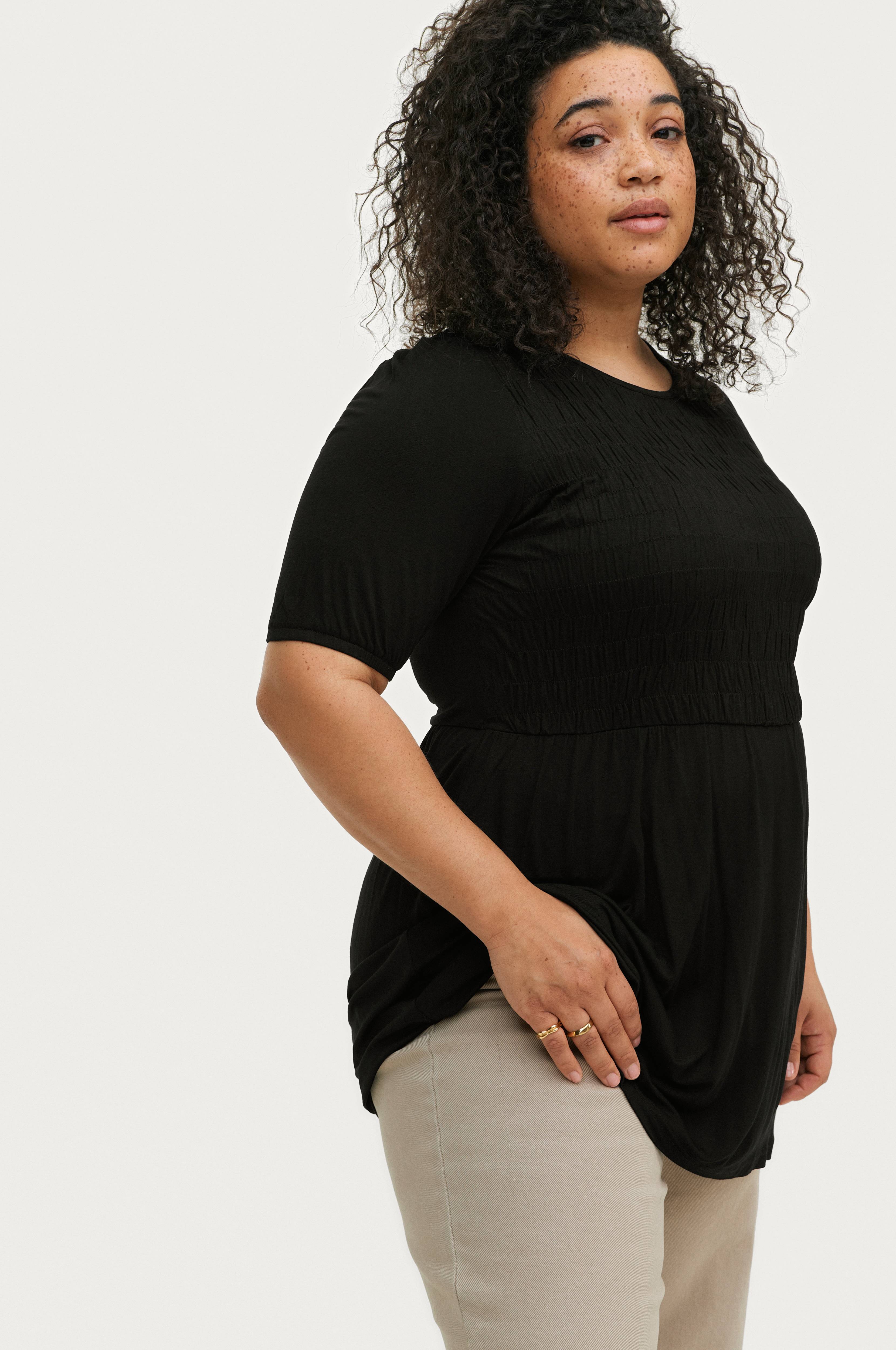 • Kort ærme med elastisk ærmeafslutning • Rund hals • Smock oppe foran • Noget længere model • Fremstillet af blød viskosejersey • Længde: 82 cm i størrelse 46/48