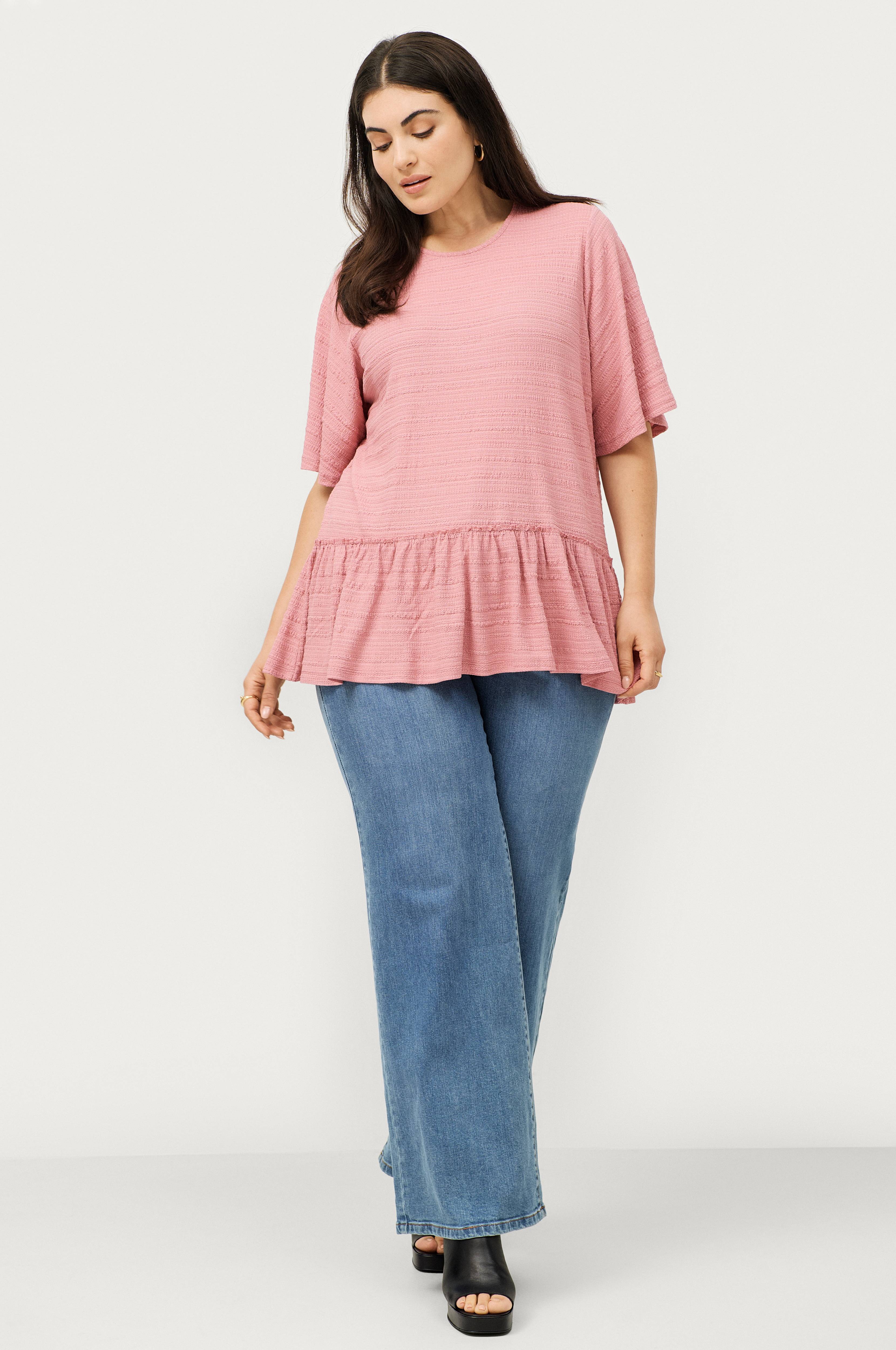 • Mønstervævet model med svaj• Rund hals• Kort, bredt ærme• Volant nederst• Længde: 79 cm i størrelse 42/44