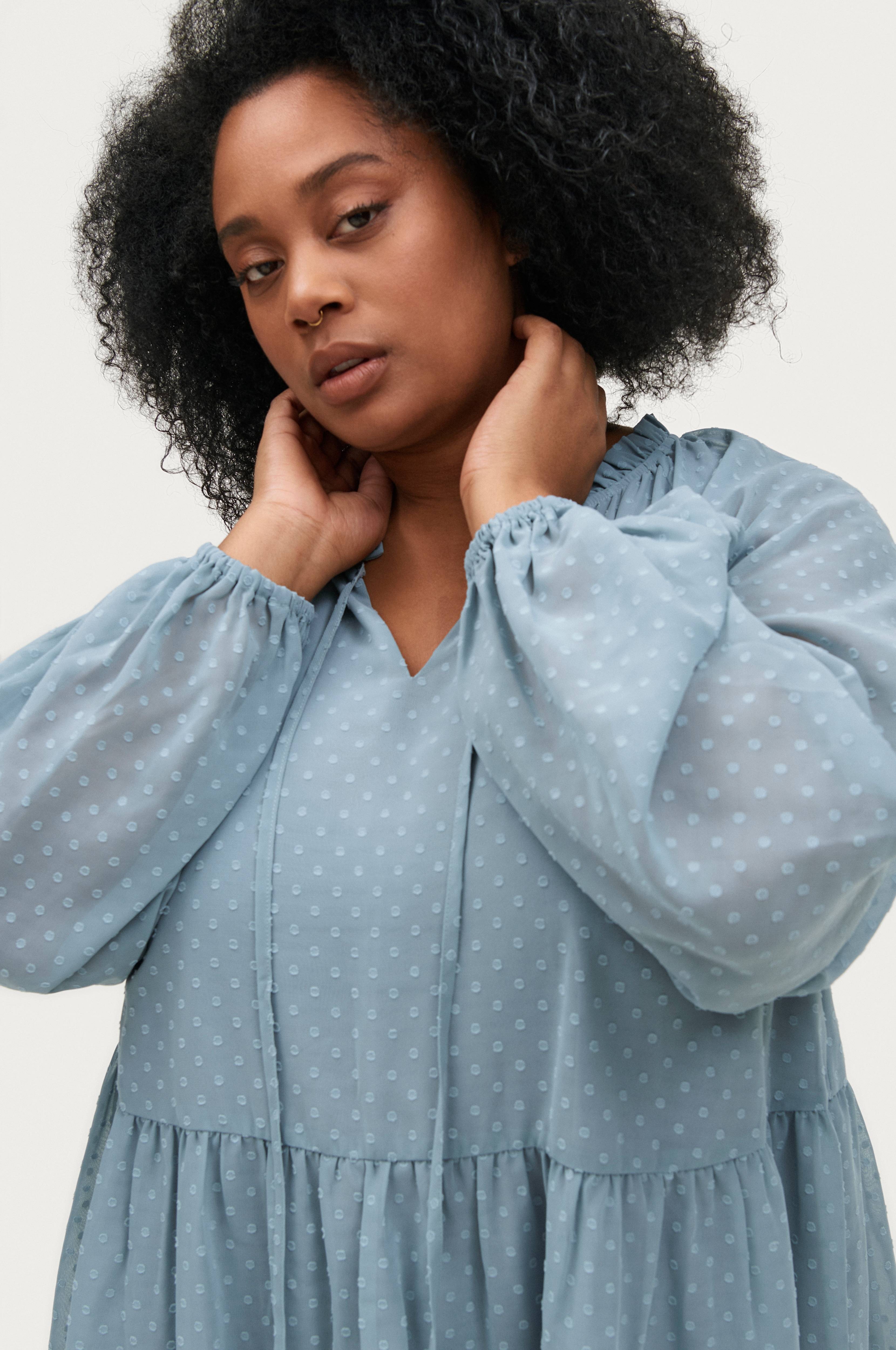 Tunika i A-formet model med flæser forneden. Rund hals med smal flæsekant rundt om og slids og bindebånd foran. Lange, vide ballonærmer med elastisk ærmekant. I chiffon med strukturmønster. Foret. Længde ca. 87 cm i str. 42/44.