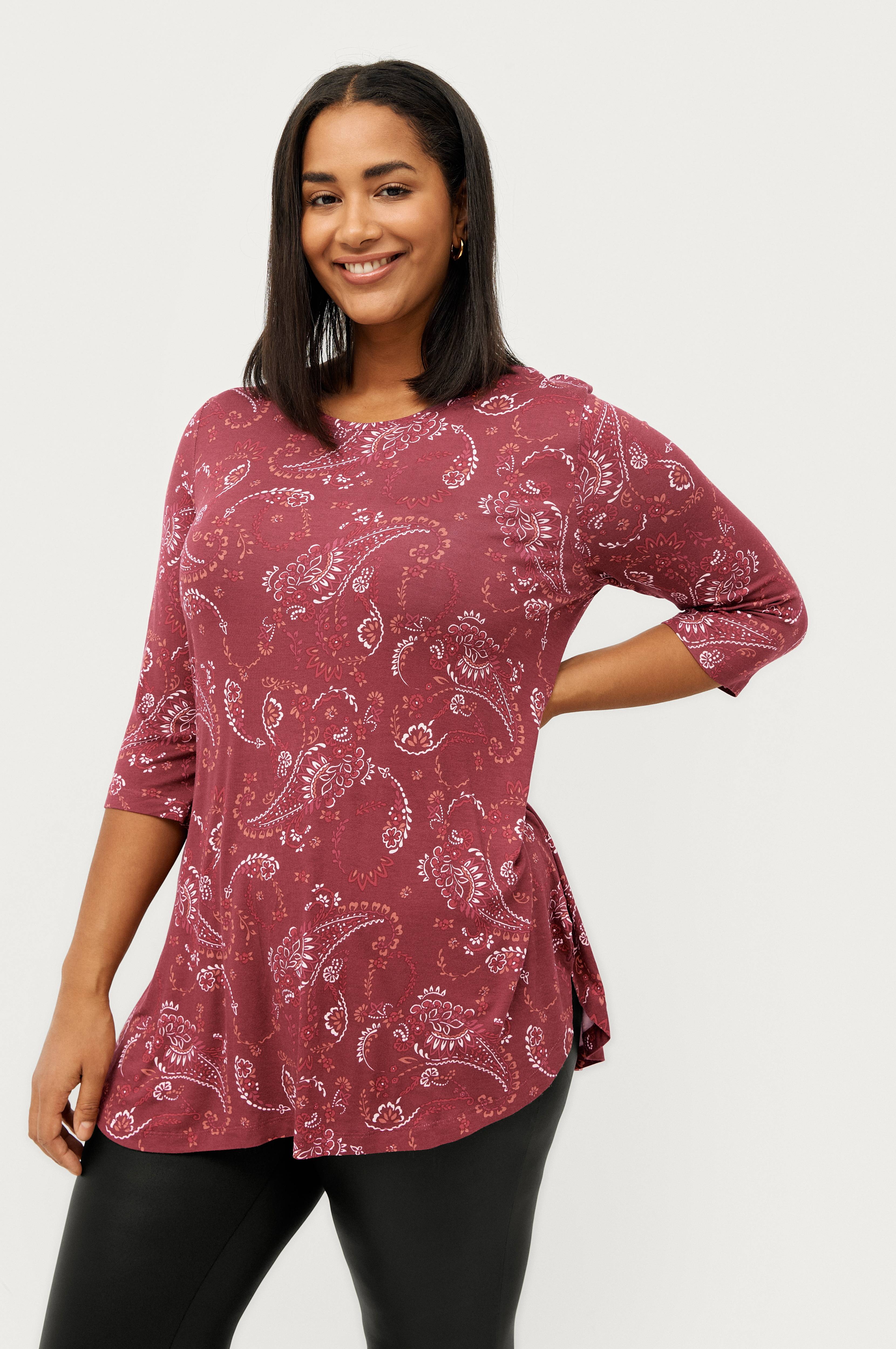 Tunika Amal i let A-formet model med rund hals, 3/4-langt ærme og afrundet kant forneden. I blød jersey. Længde bagpå ca. 82 cm i str. 46/48.