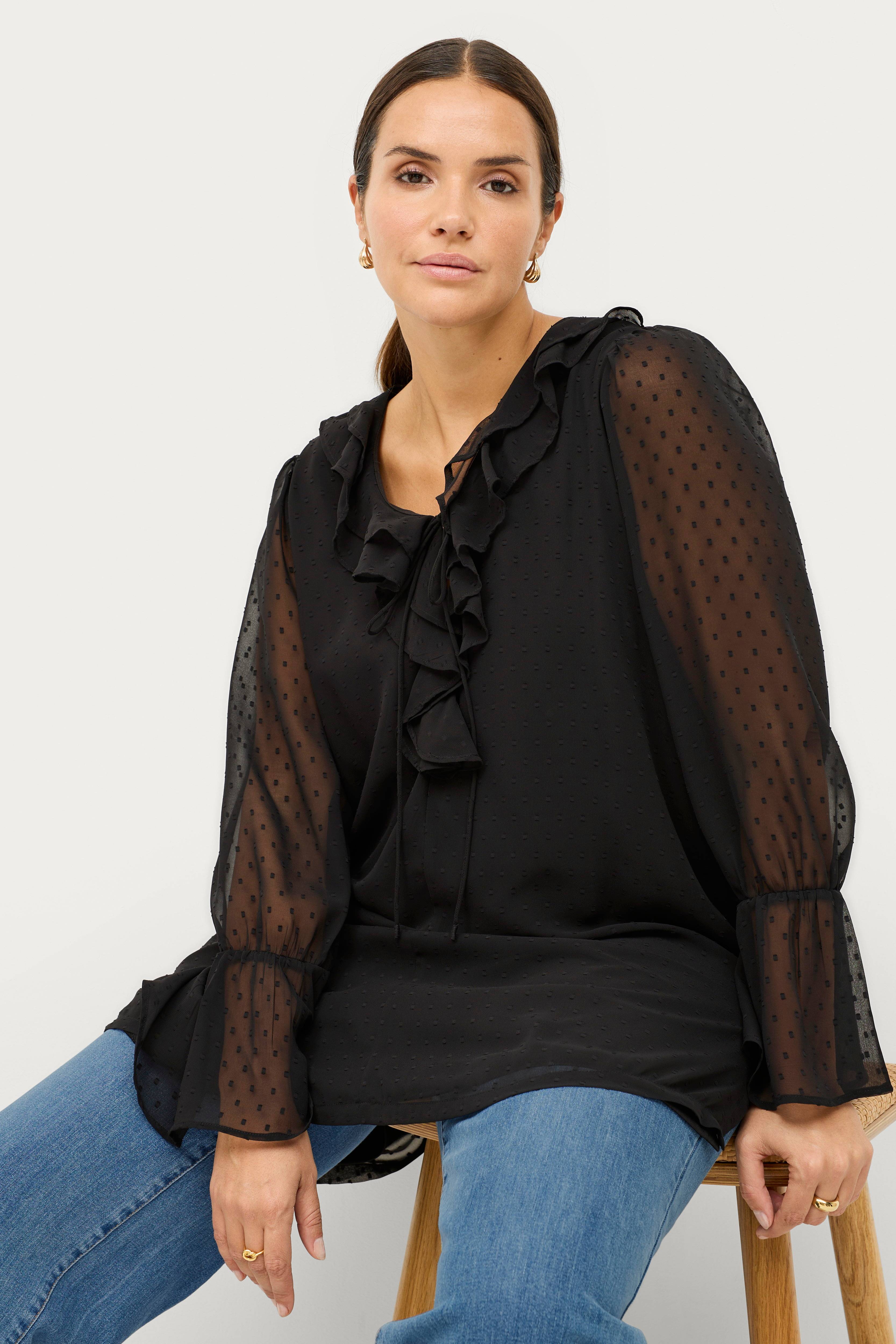 • Foret tunika i chiffon • V-formet halsudskæring med volant hele vejen rundt og bindebånd foran • Uforede ballonærmer med elastisk bånd ved manchetterne • Slidser i siderne • Længde: 88 cm i størrelse 46/48