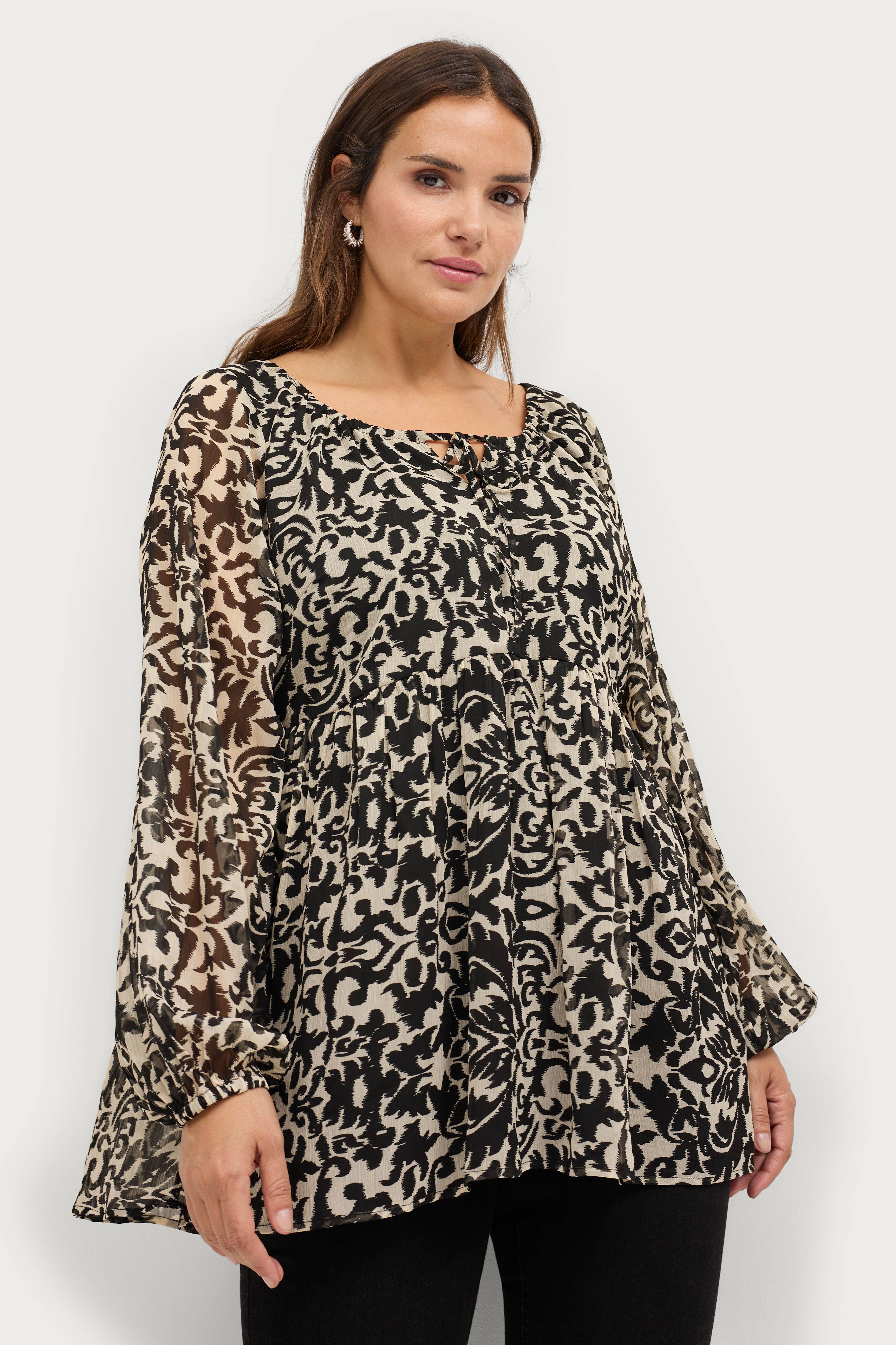 • Model med svaj i crepe• Bred halsudskæring med træksnørre• Rynket talje• Langt, bredt ærme med elastisk manchet• Længde: 78 cm i størrelse 42/44