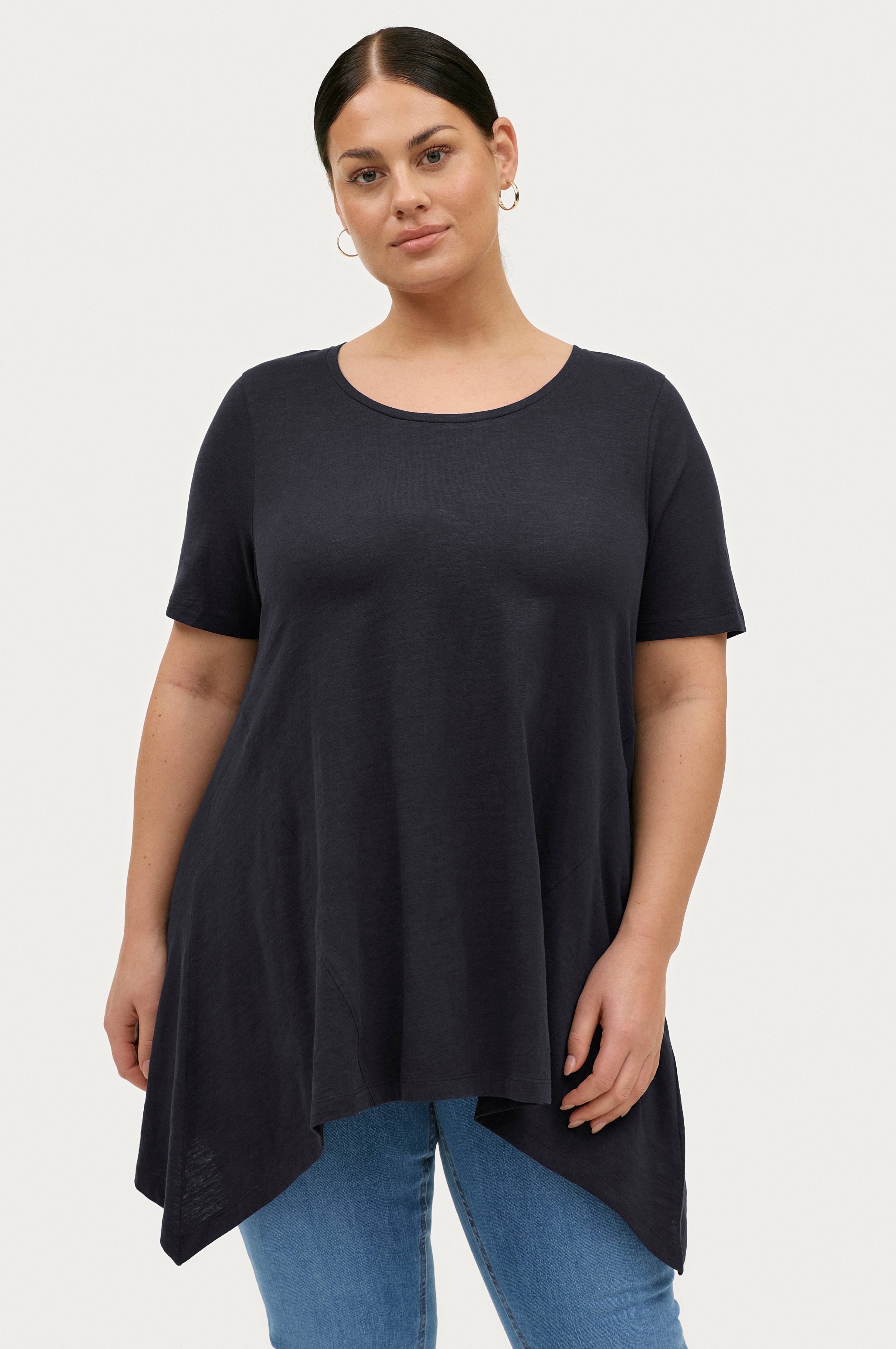 Tunika i skøn bomuldsjersey med uregelmæssig slubstruktur. A-formet model med asymmetrisk kant forneden og diagonale sømme både foran og bagpå. Korte ærmer og rund hals. Længde, længste mål i siden ca. 88 cm i str. 42/44.