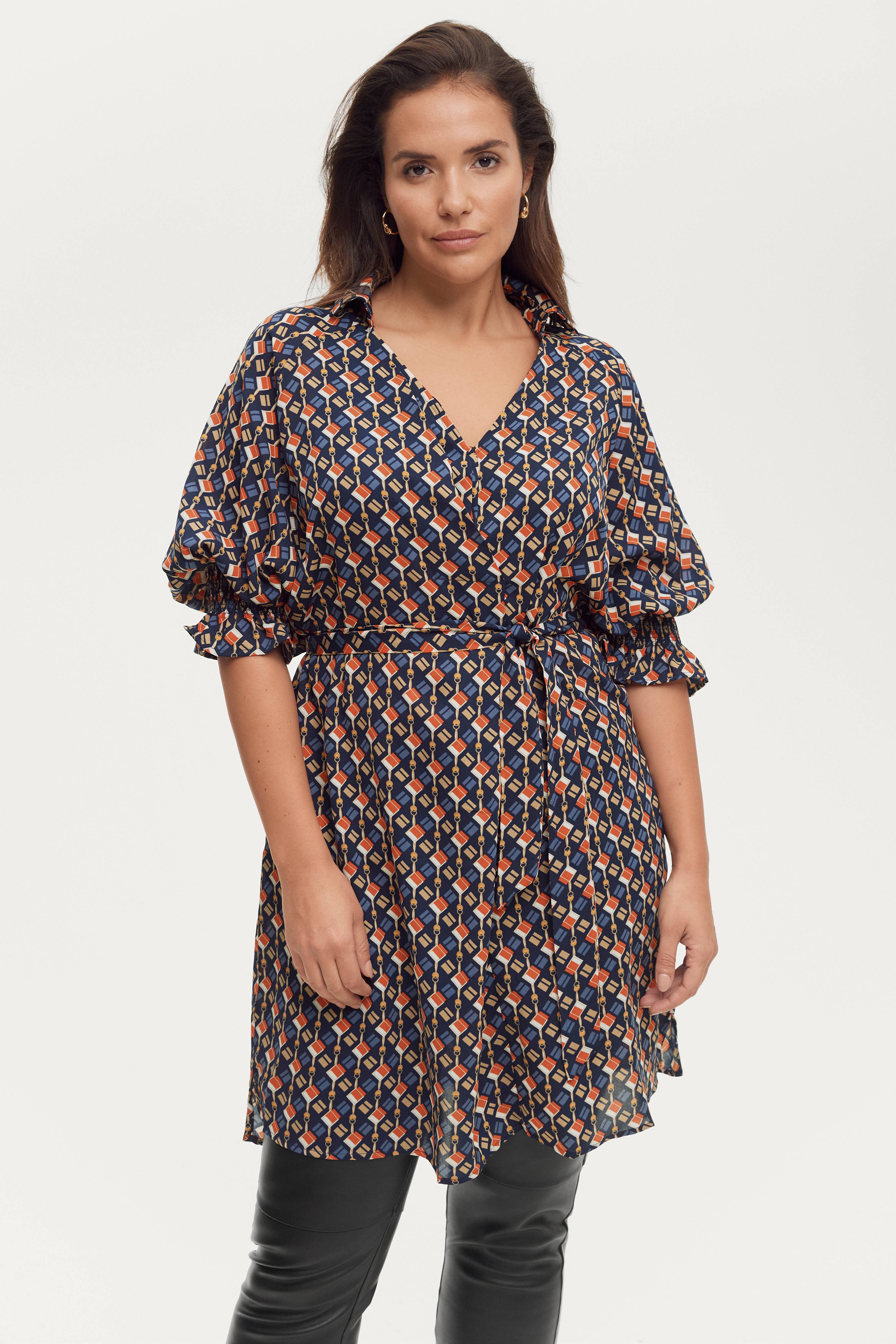 Tunika Elisabeth i lige model med løst snit. V-hals med påsyet krave i nakken og lagt draperingslæg på brystet. Vide, raglanærmer i 3/4-længde med bred smockelastik forneden. Bindebælte i taljen og indsatte lommer i siderne. Længde ca. 98 cm i str. 42/44.