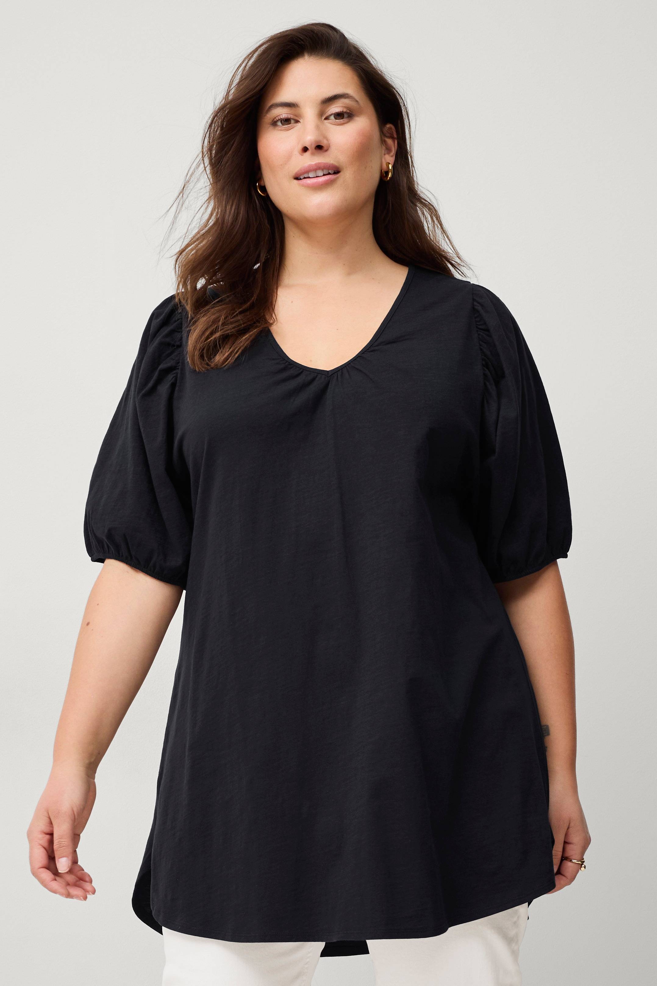 • A-linje design• V-udskæring med samling• Korte ballonærmer• Afrundet søm• Længde: 90 cm i størrelse 46/48