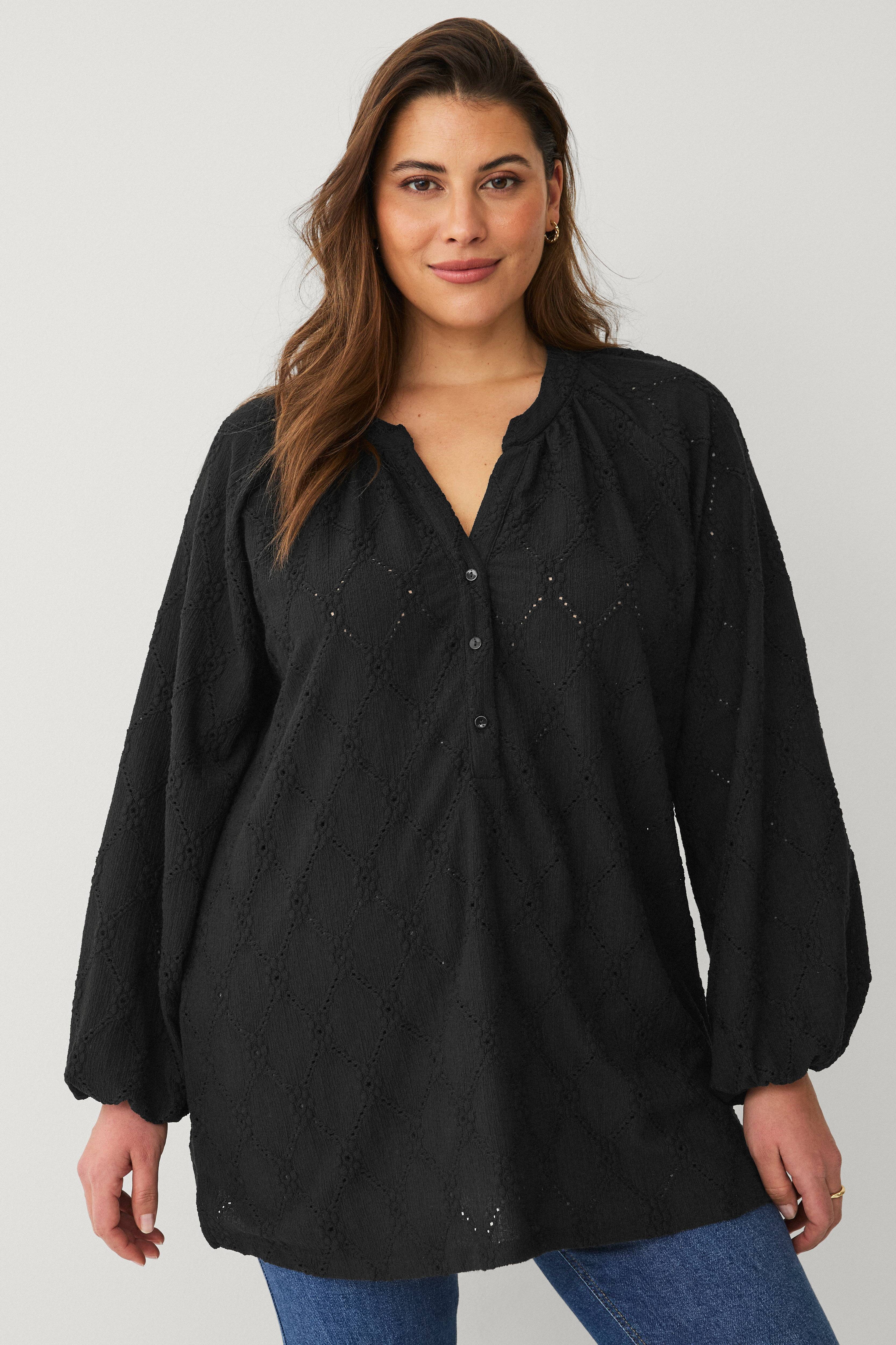 • Tunika i luftig blanding af polyester og elastan med et hulbroderi