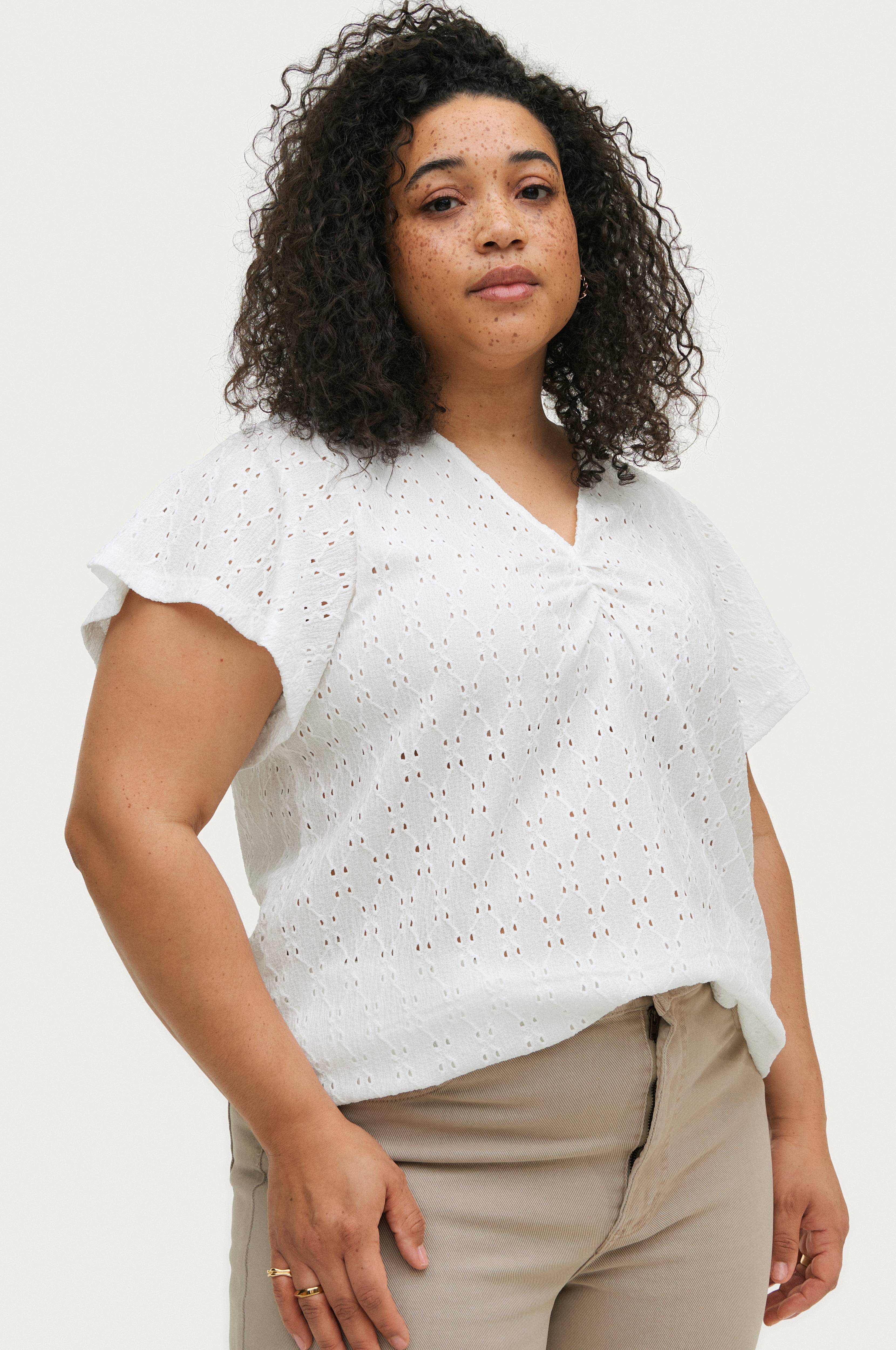 Tunika i jersey med let stretch. Broderi og hulmønster rundt om. Korte flæseærmer og V-formet halsudskæring med rynkning midt foran. Længde ca. 84 cm i str. 46/48.