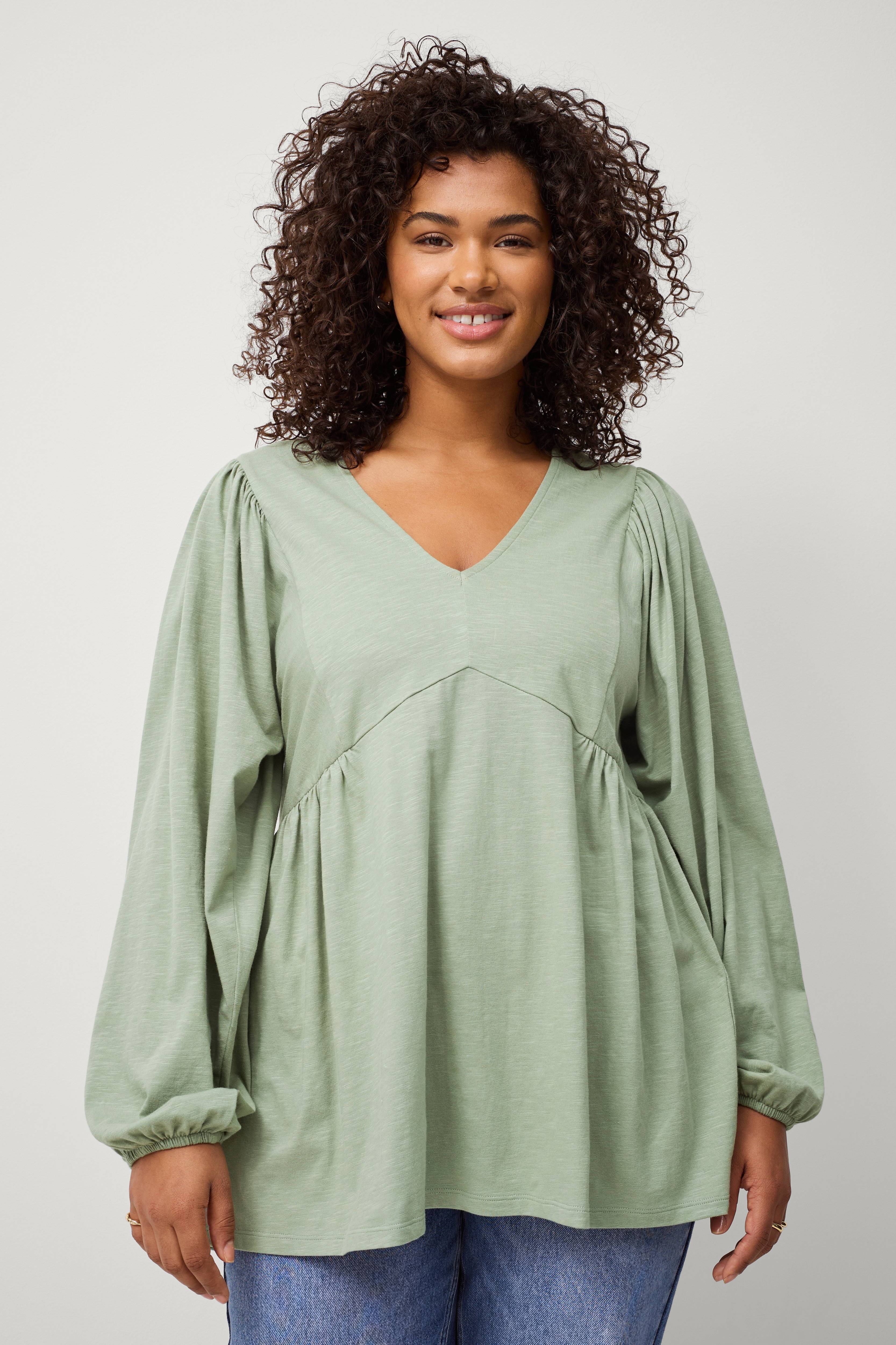 • Model med svaj med samling i siderne• V-udskæring• Lange pufærmer med elastiske manchetter• Længde: 78 cm i størrelse 46/48
