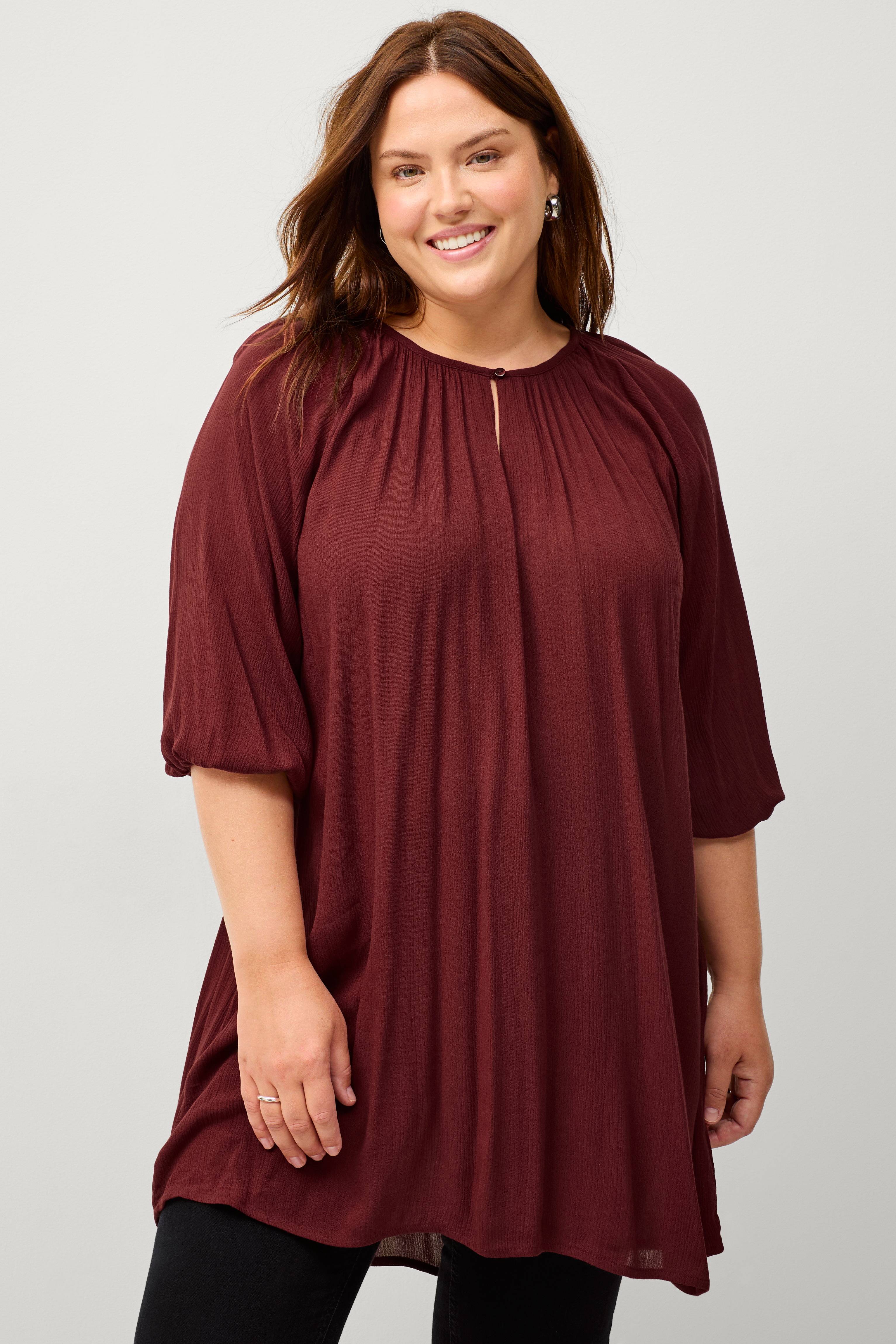• Model med svaj• Rund hals med plissering hele vejen rundt og knap foran• Bredt, 3/4 langt raglanærme med elastisk manchet• Længde: 88 cm i størrelse 46/48