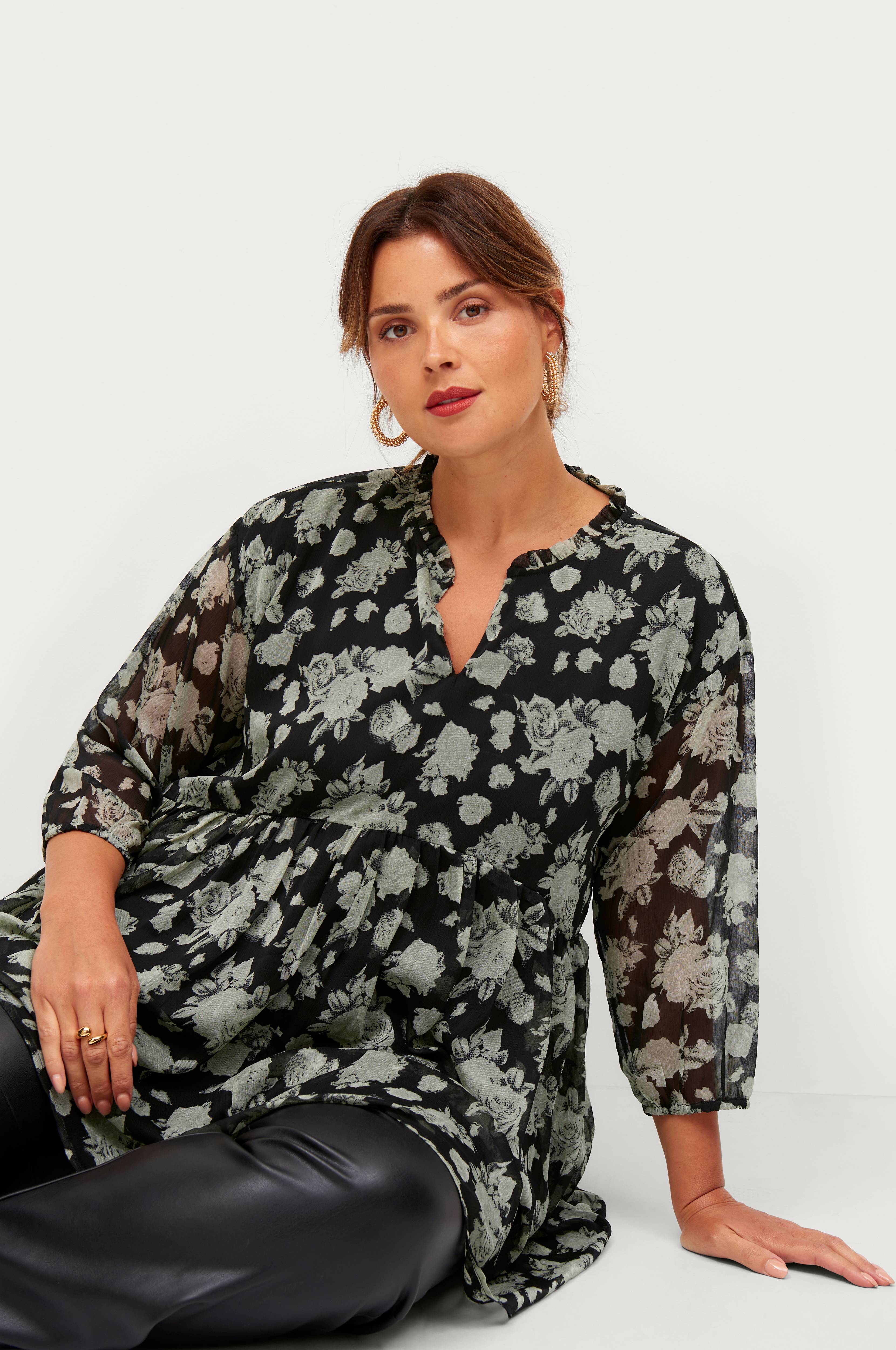 • Model med svaj • Løs pasform • V-udskæring med tynd flæsekant • 3/4 lange ærmer med elastiske manchetter • Fremstillet af chiffon • For i jersey • Længde: 92 cm i størrelse 46/48