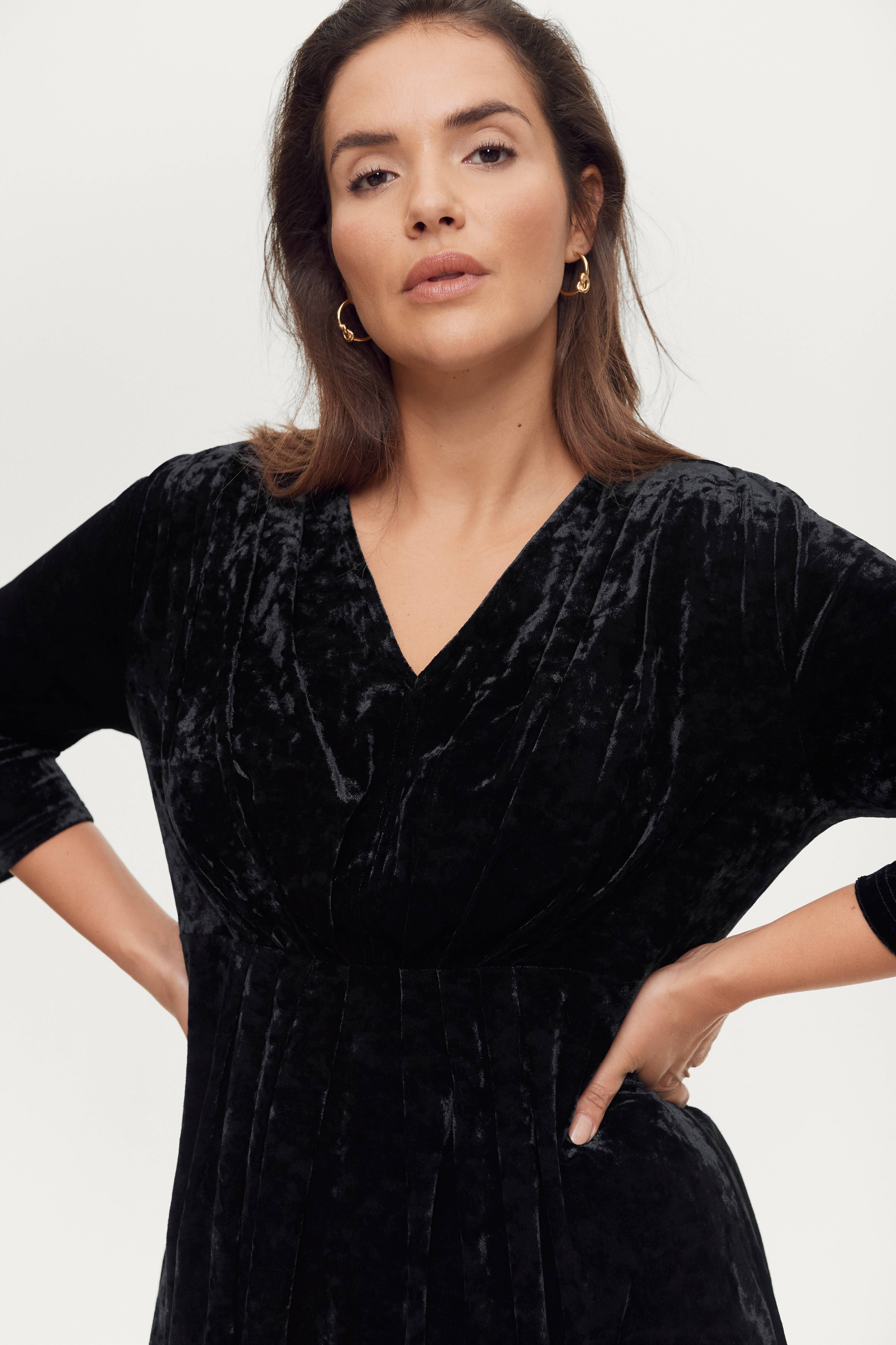 Velourtop Mary i let figursyet model. Afskæring rundt om i taljen med flotte, lagte læg foran. V-formet halsudskæring med smal søm og lagte læg, også foran på skuldrene samt lige, 3/4-langt ærme. Længde ca. 77 cm i str. 42/44.