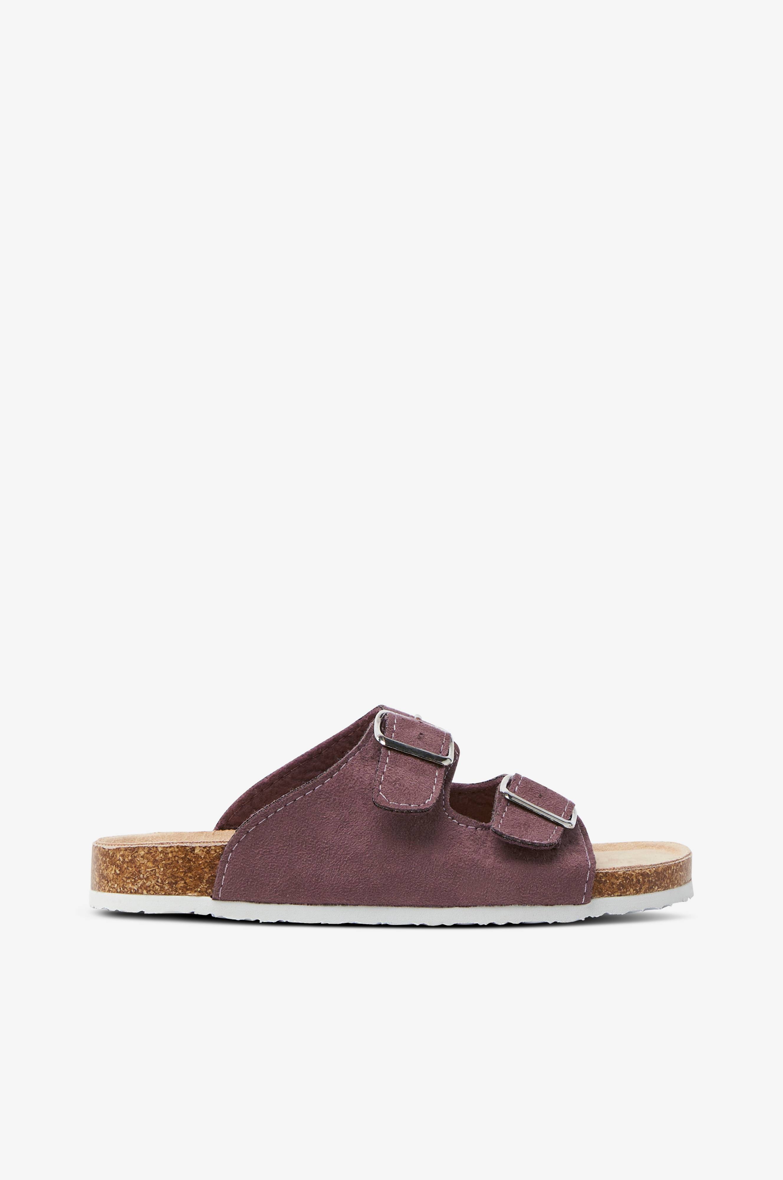 Behagelig, fodformet og stabil model med anatomisk fodseng. Remme i blødt ruskind med justerbare metalspænder. Fodformet indersål med velour-touch.
