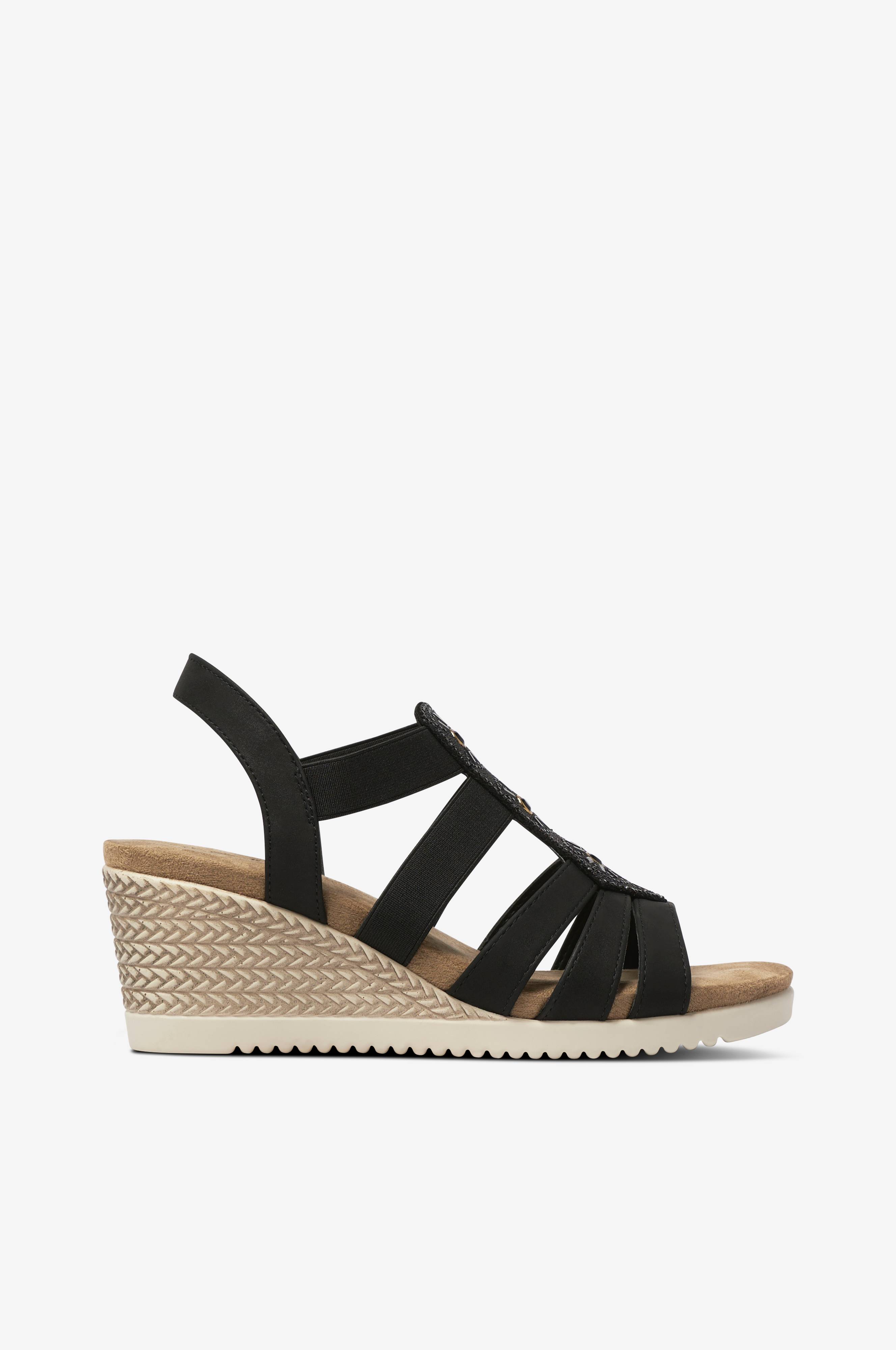 • Remme i imiteret læder og elastik• Udsmykning foran• Mønstervævet wedgehæl• Blød fodseng• Hælhøjde: 7 cm