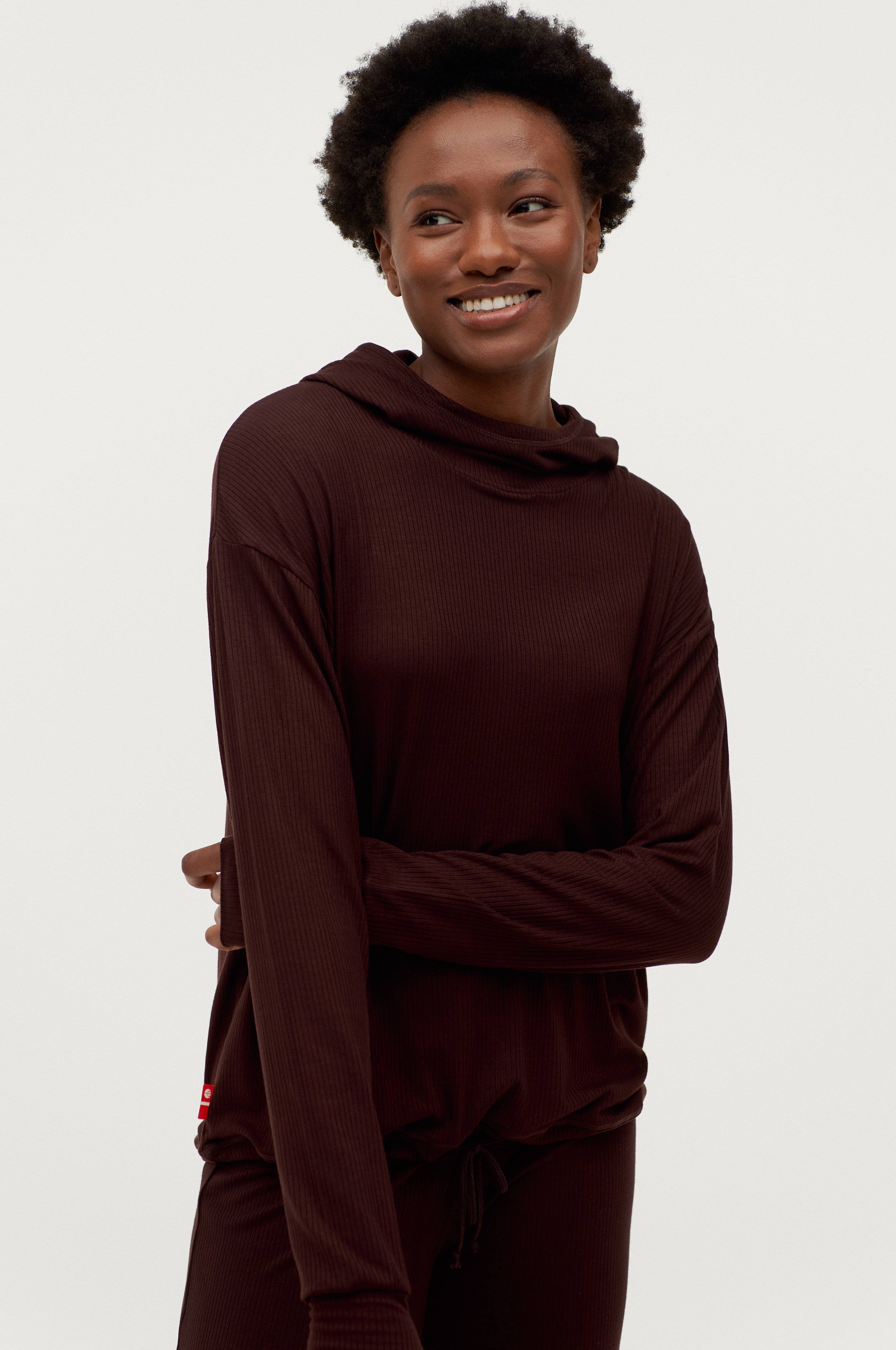 • Fremstillet af blød, ribbet viskosejersey • Høj udskæring med hætte • Nedsænkede skuldre • Bred manchet ved manchetterne • Træksnørre nederst • Længde: 64 cm i størrelse 36/38