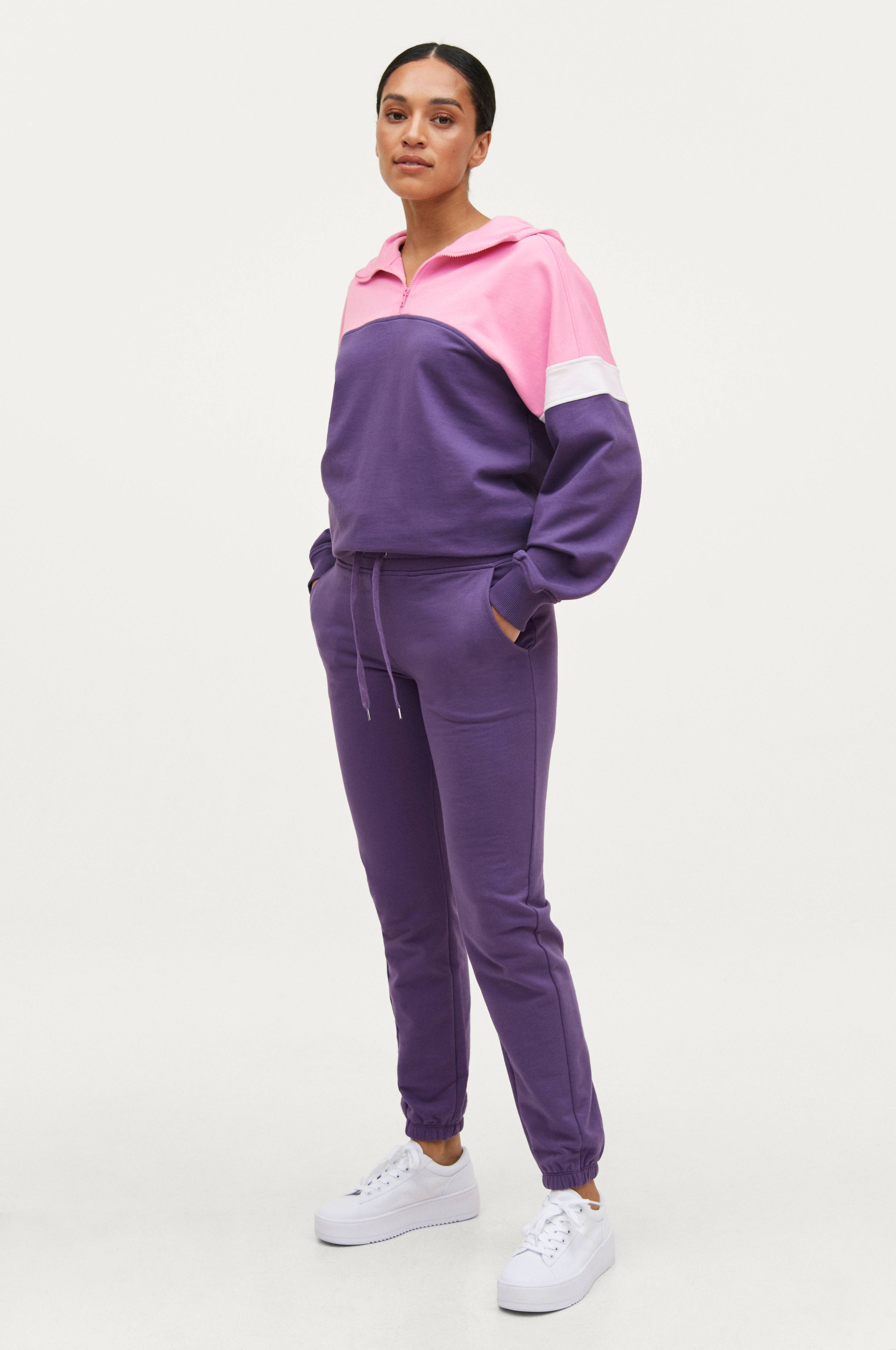 Sweatbukser i bomuldsblanding med drejet søm foran på benene. Bred, elastisk talje med løbegang, lommer i siderne og elastik i benkanten. Indvendig benlængde ca. 78 cm i str. 34/36.