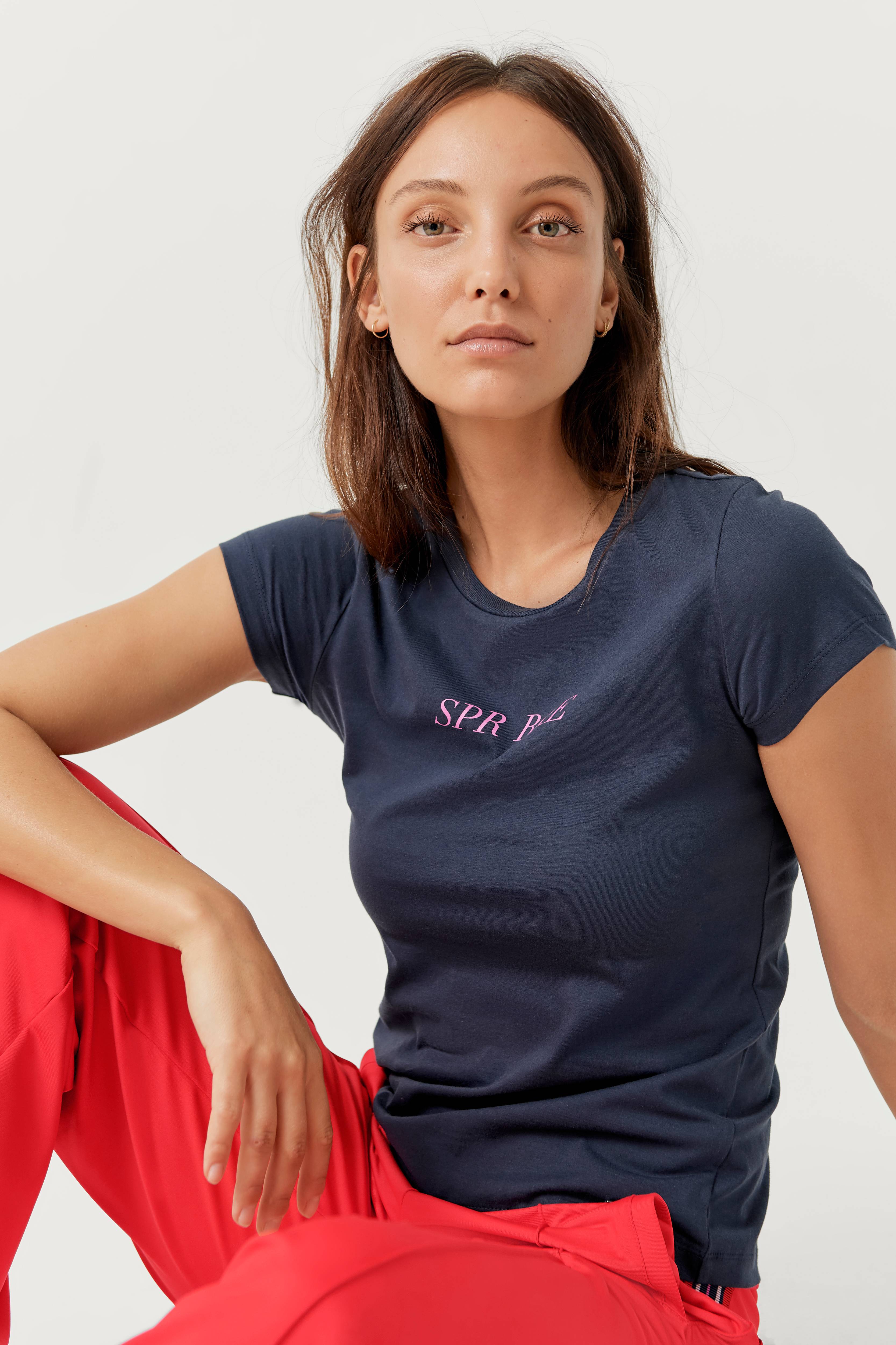 Top SPR i blød bomuldsjersey med print foran. Smal model med kort ærme og rund hals med ribkant. Længde ca. 60 cm i str. 34/36.