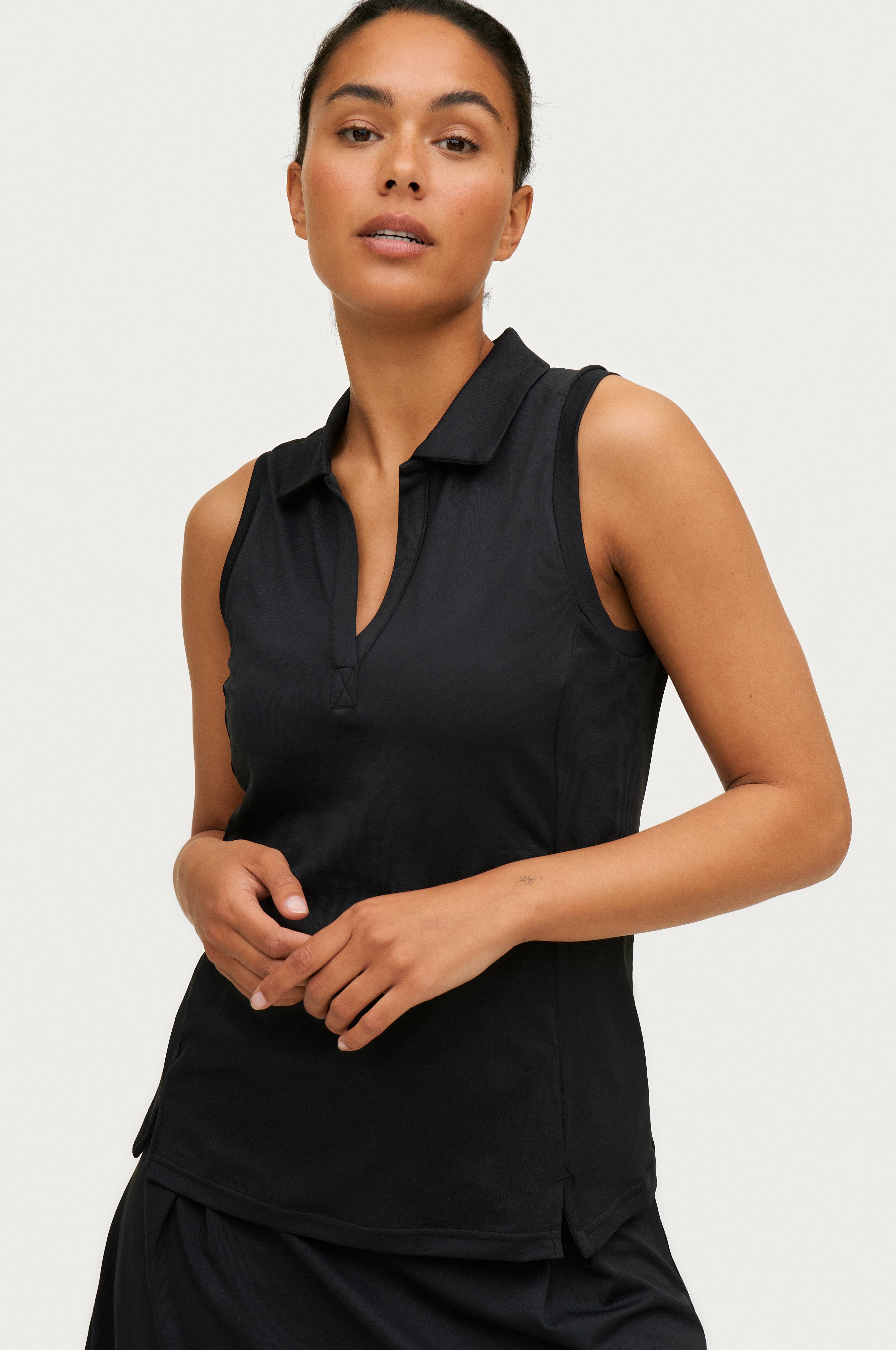 Funktionstop i hurtigtørrende materiale perfekt til padelspillet eller golfrunden. Ærmeløs model med V-udskæring og krave. Slids forneden i siderne foran. Længde ca. 62 cm i str. 36/38.