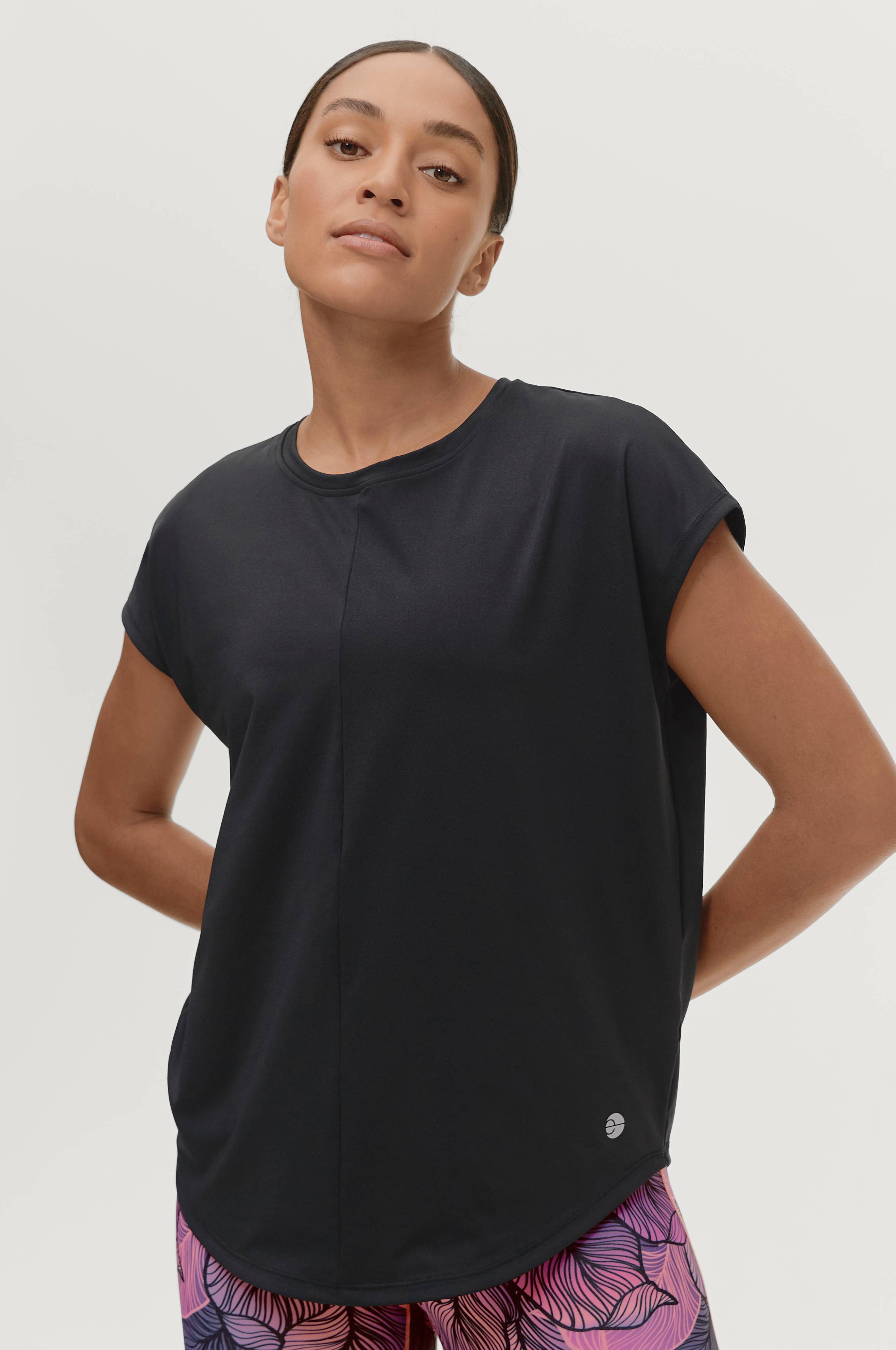 Kort træningstop i løs pasform, fremstillet i det hurtigtørrende funktionsmateriale med stretch Fastdry som transporterer fugt væk. Rund hals med ribkant og delesøm på langs midt foran. Afrundet kant forneden.