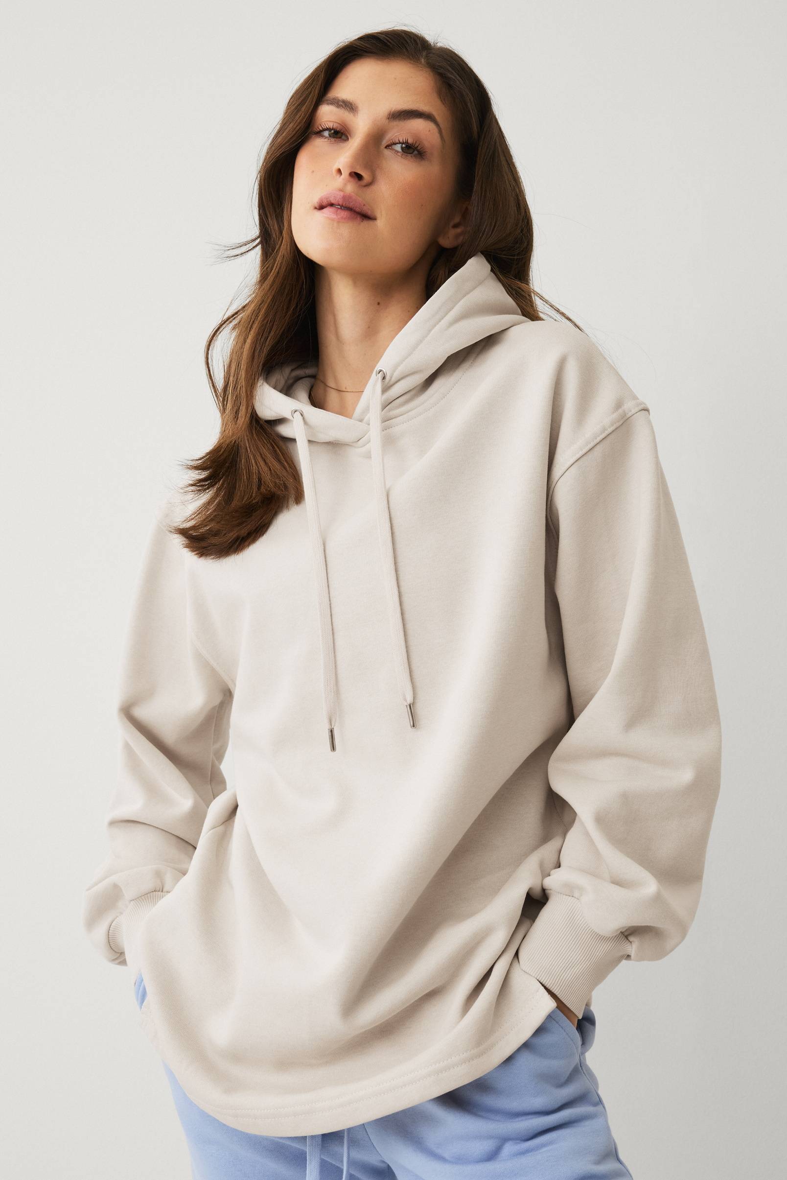 • Lang sweatshirt med hætte og træksnørre • Ribmanchetter ved manchetterne • Slids nede i siderne • Blød børstet inderside • Længde: 75 cm i størrelse 36/38