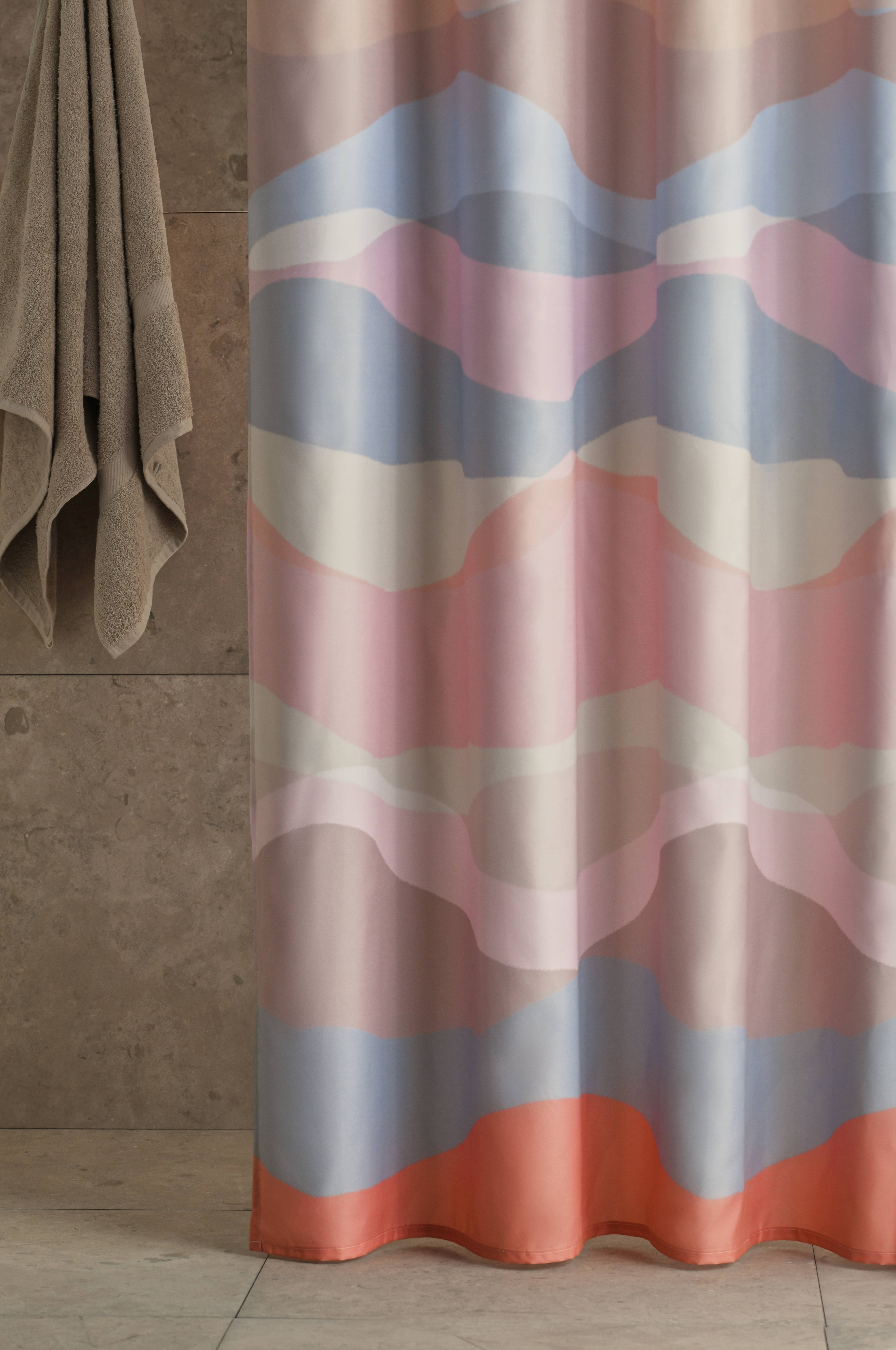 Digitalprintet badeforhæng med fint fald og blødt som stof. 10 metalringe. Str. 180x200 cm.