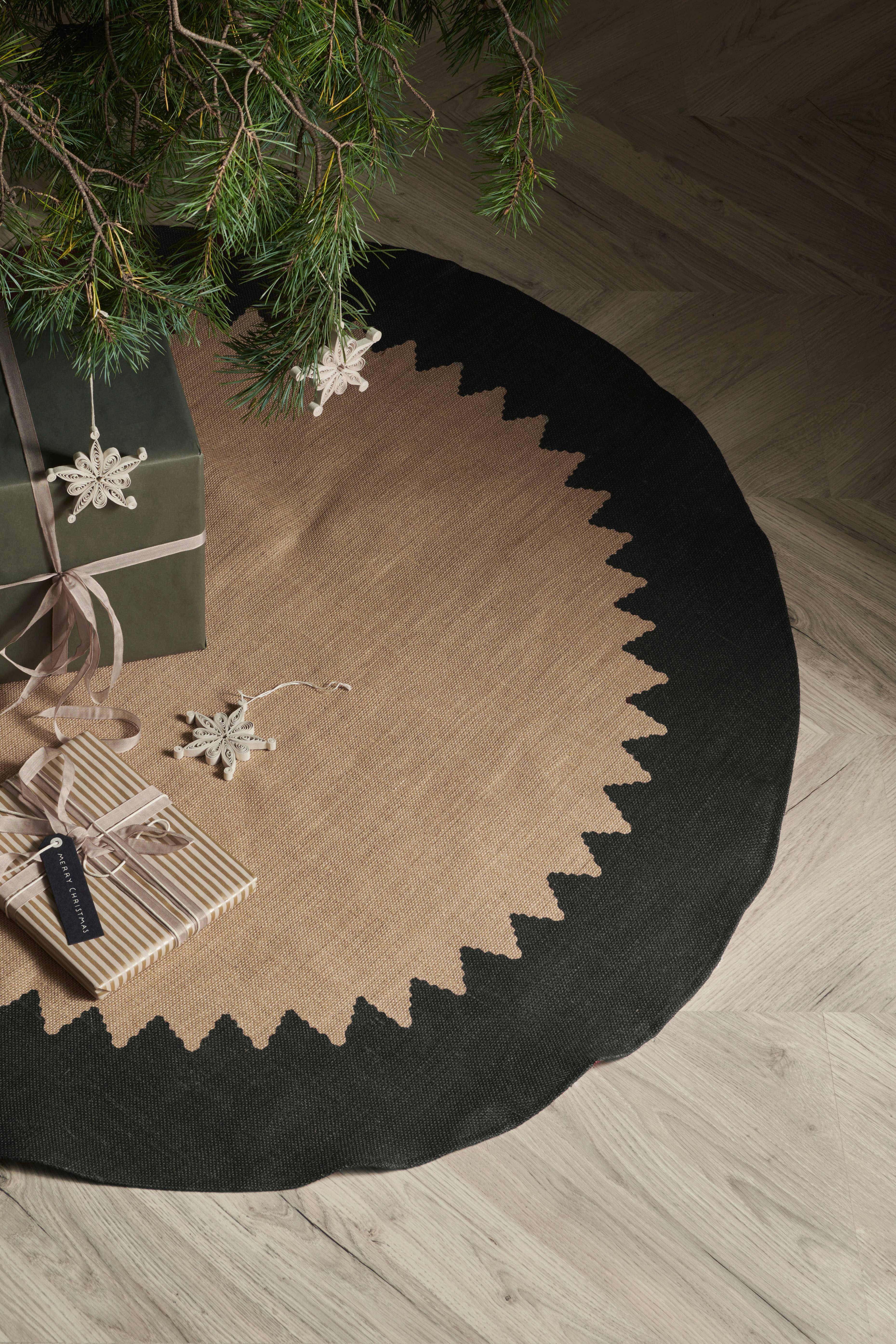 Rundt juletræstæppe i jute med print rundt om. Diameter 120 cm.
