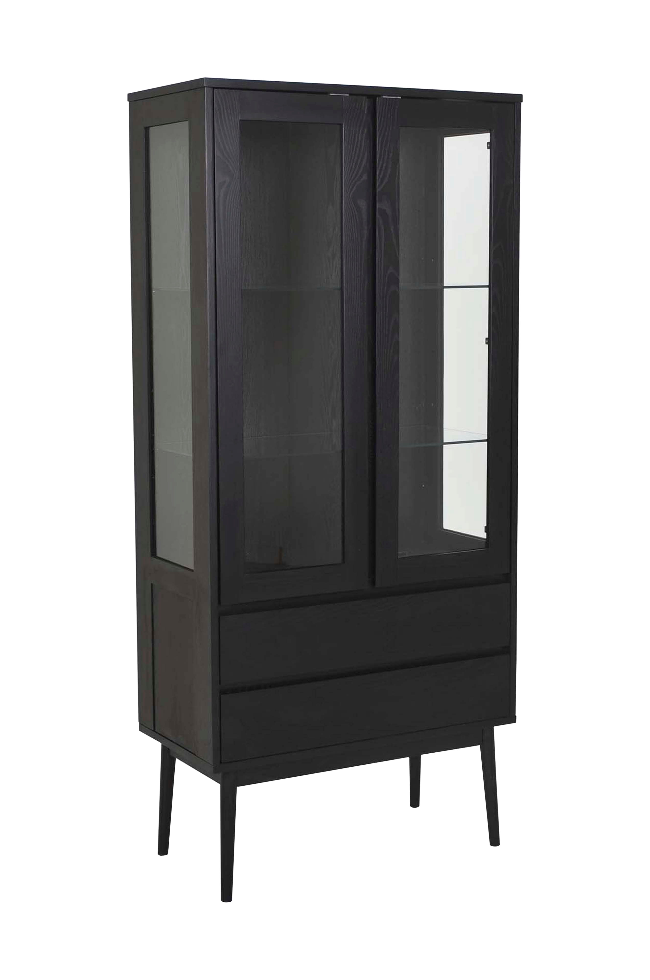 Vitrineskab i lakeret askefiner.Ben i lakeret, solid eg. 2 skuffer og 2 glaslåger med 2 justerbare hylder i glas. Maks. vægt skuffe: 8 kg. Maks. vægt hylde: 10 kg.Højde: 176,5 cm. Bredde: 80 . Dybde: 40 cm.Materiale: Eg/MDF/askefiner