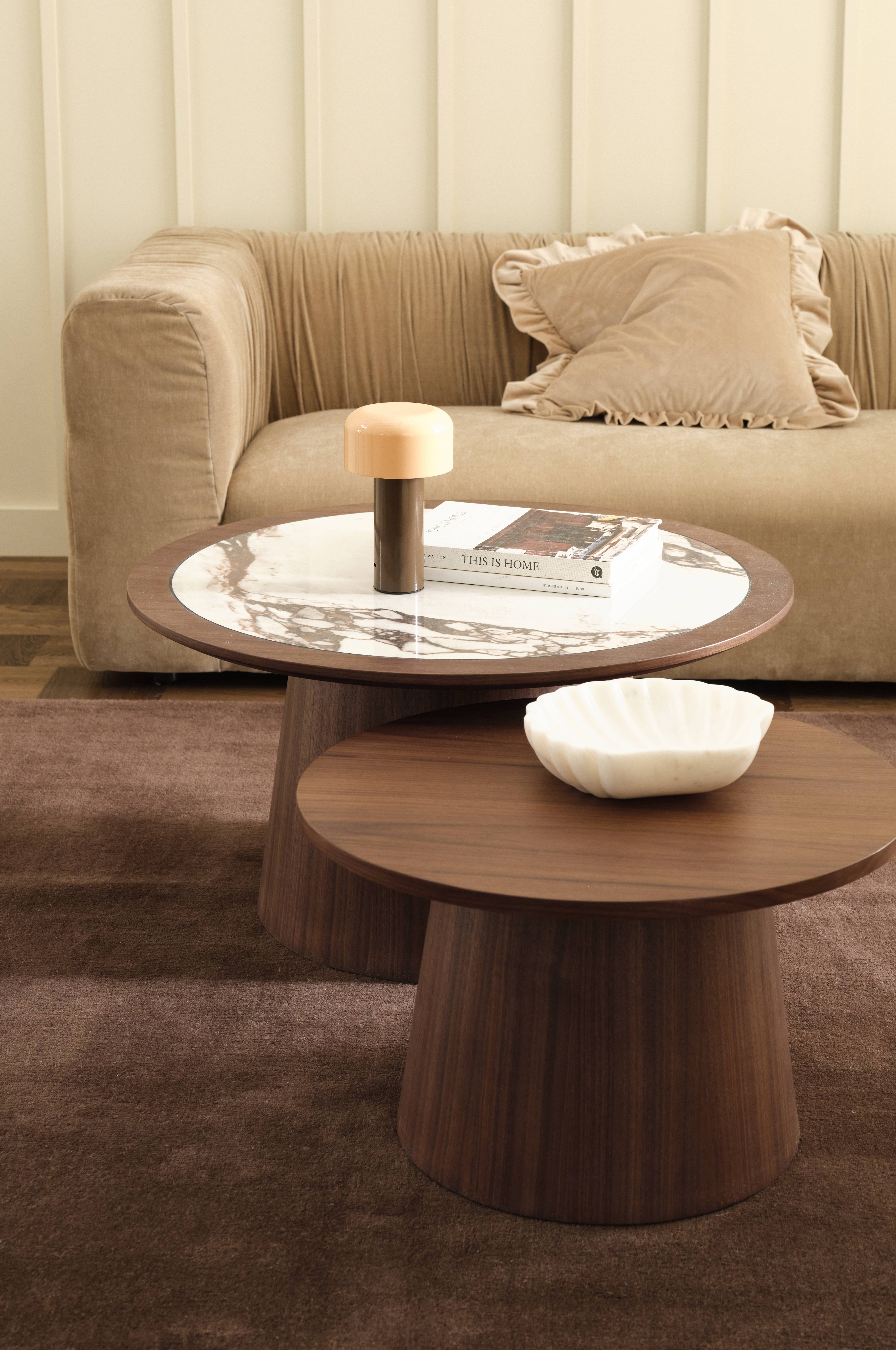 • To runde, matchende sofaborde med anderledes størrelser• Valnøddefinért skelet i krydsfiner og MDF• Større sofabord med bordplade i keramisk marmor• Mål på stort bord: Ø80 cm. Højde 45 cm.Mål på det lille bord: Ø60 cm. Højde 36 cm