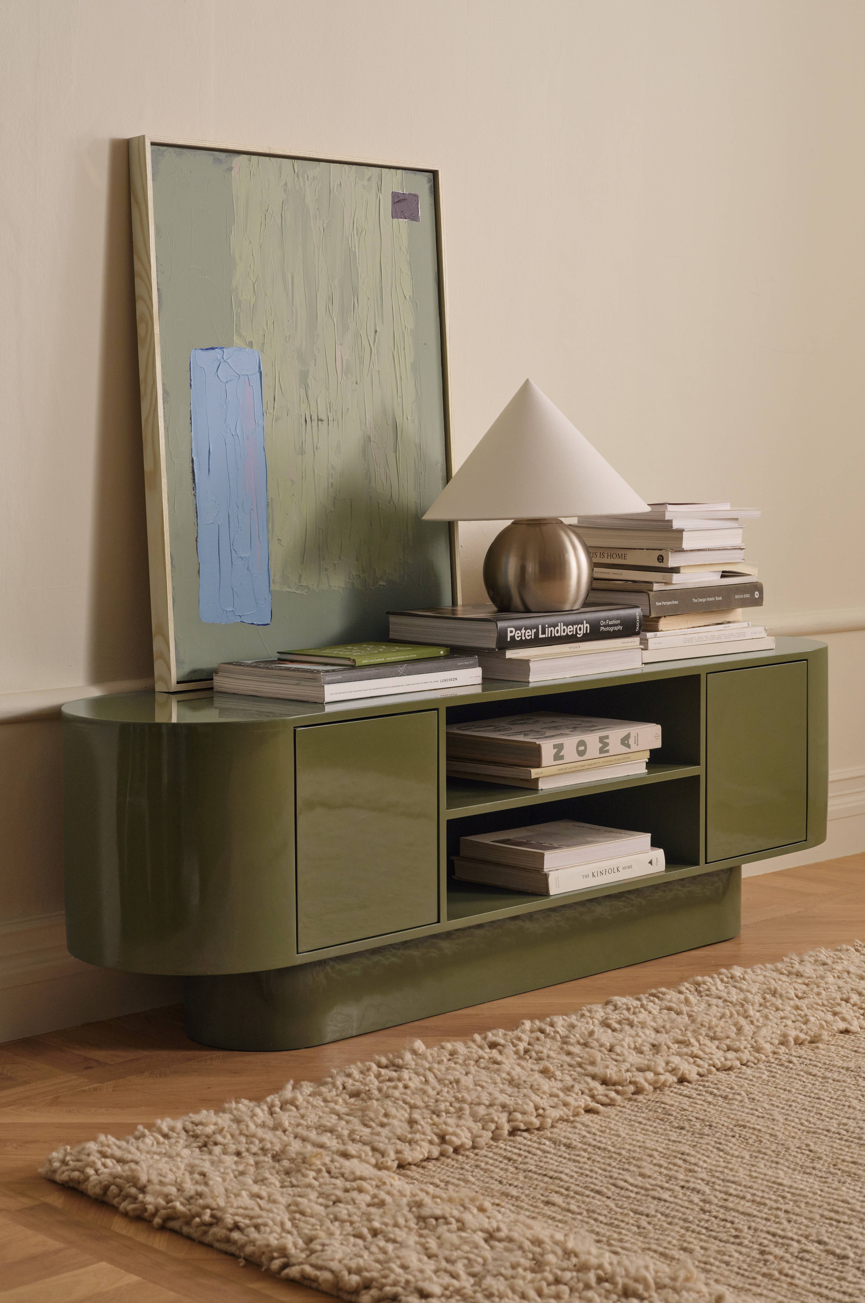 • Tv-bord i skinnende MDF• To skabe med døre med push-funktion• To åbne hylder• Maks. vægt: 50 kg• Vægbeslag medfølger.• Skruer og plugs medfølger ikke