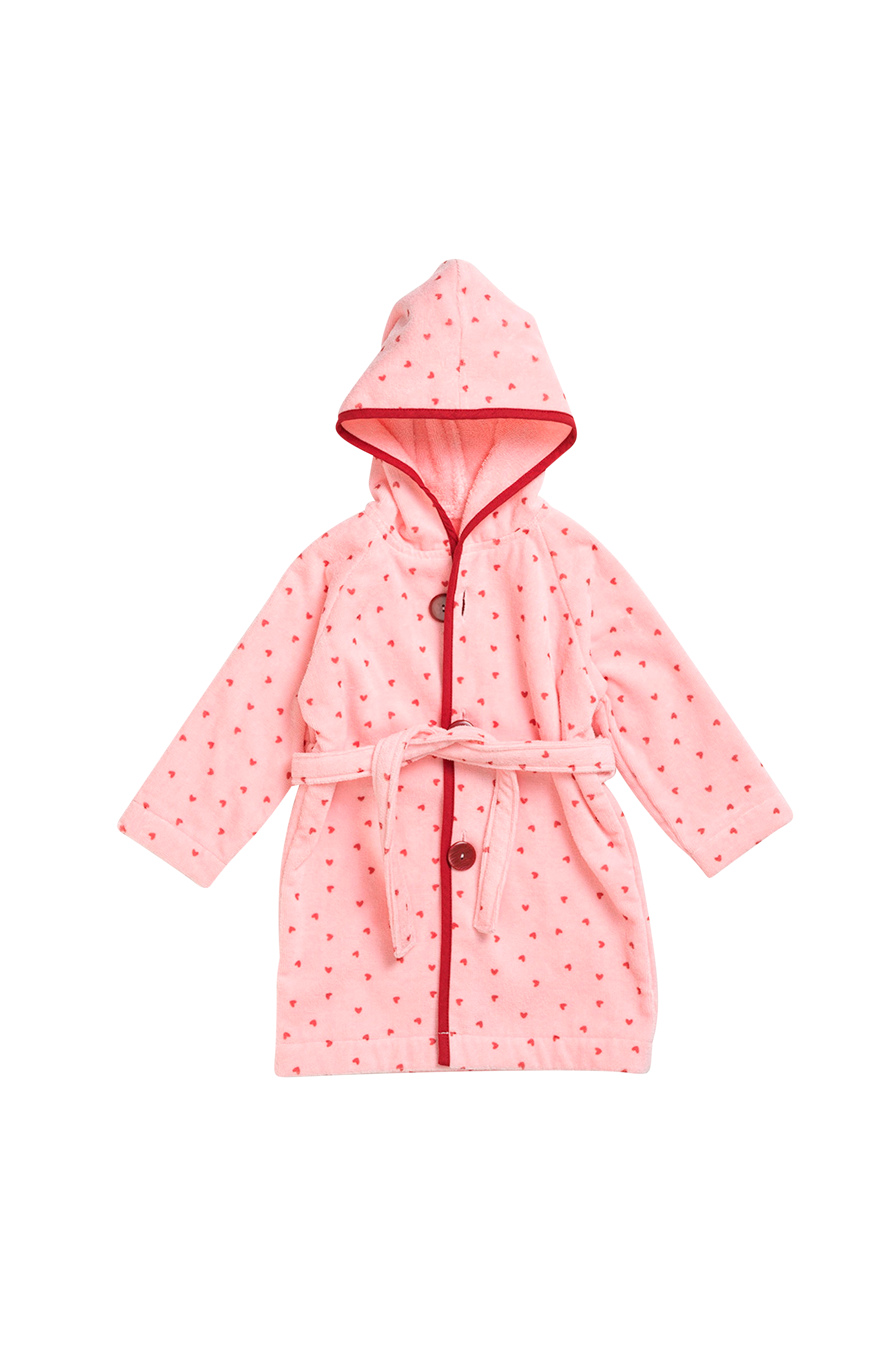 Afslappet pasform med hætte, tre store knapper foran og bindebælte i taljen.