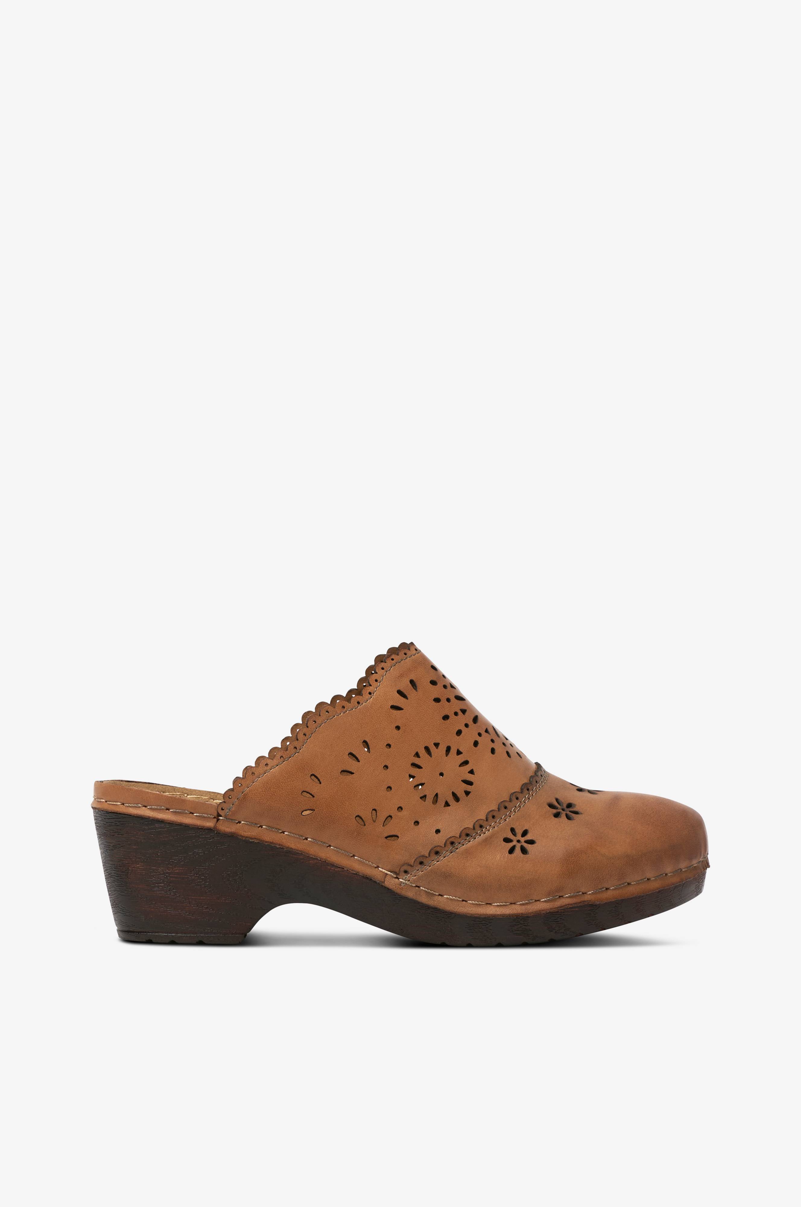 Sandaler i træskomodel med overdel i skind med hulmønster. Bred hæl i trælignende materiale. Hælhøjde ca. 6 cm.