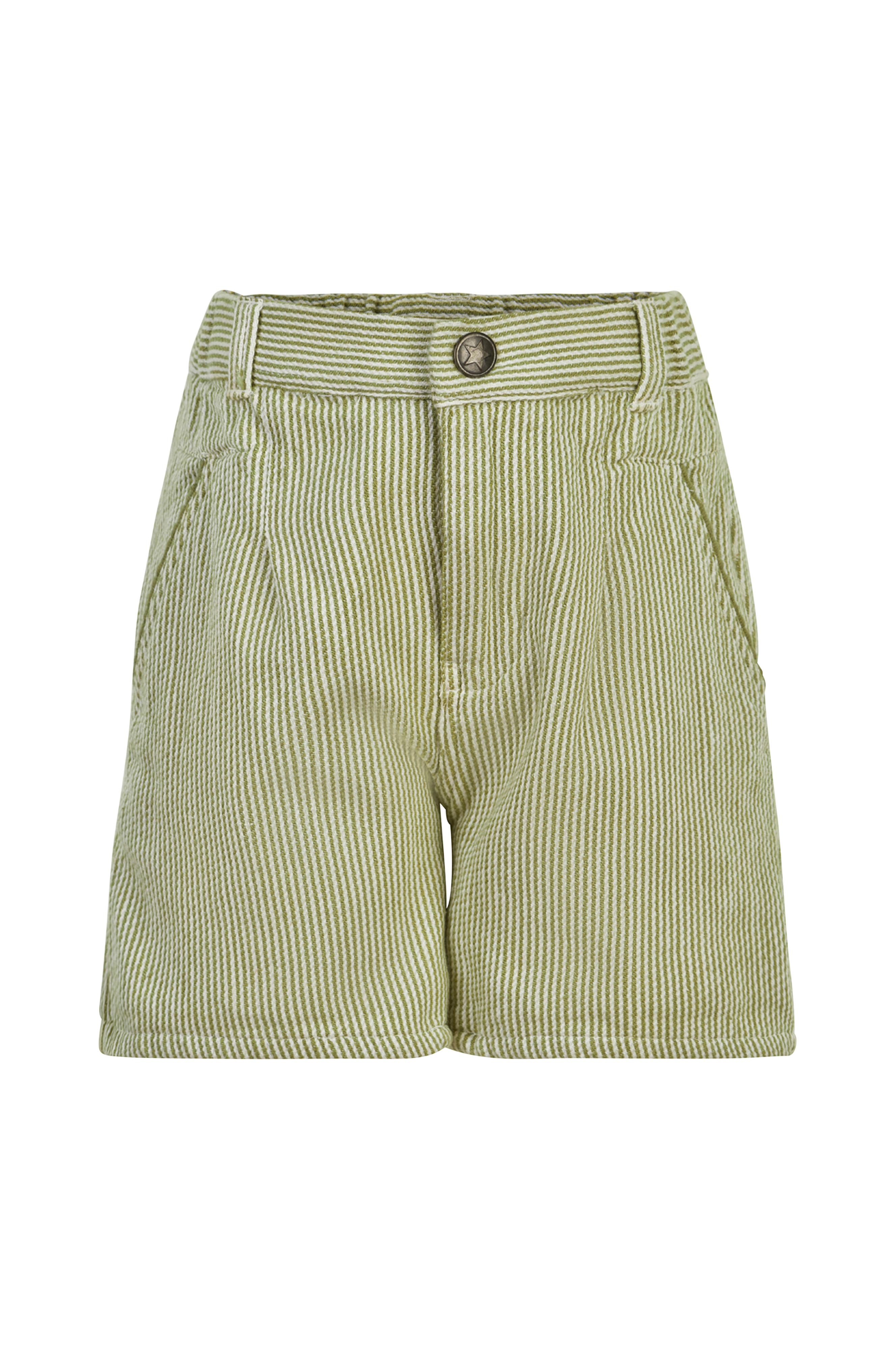 Shorts i vævet kvalitet med striber. Lommer i siderne og lommer bagpå. Gylp med lynlås og hægte/malle med pynteknap foran. Justerbar talje med indvendig knapelastik.