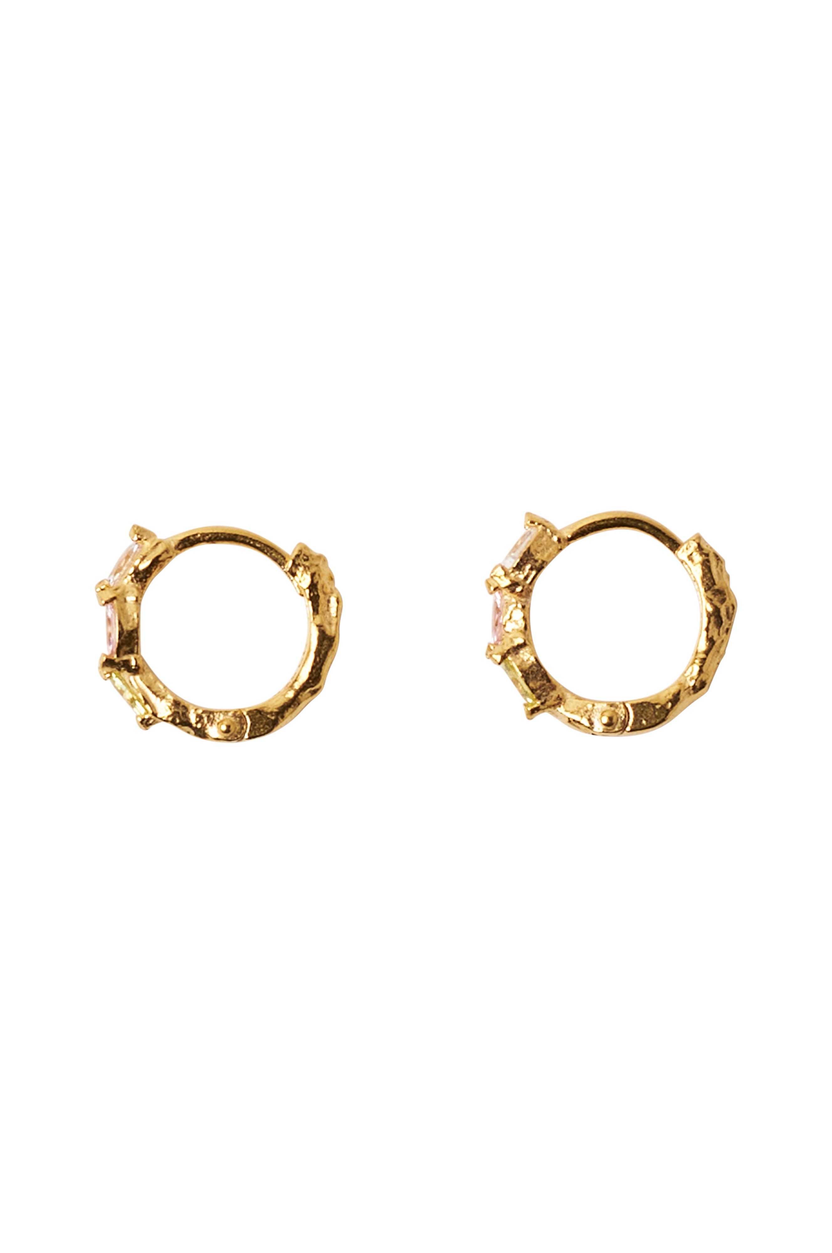 Øreringe i 18k guldpletteret sølv med zirkoner i forskellige farver. Diameter 11,5 cm.