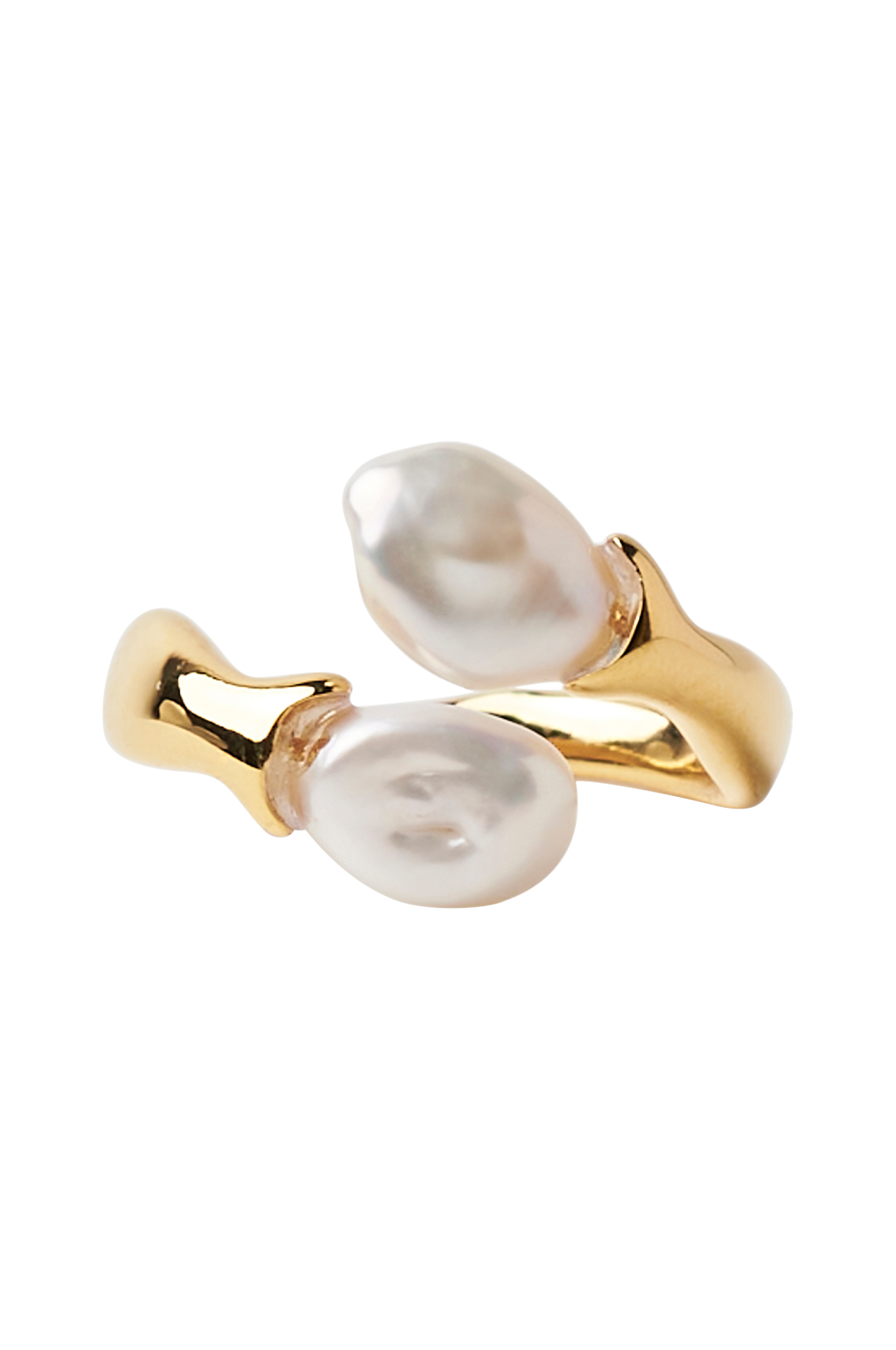 Ring i 18 guldpletteret sølv med to ferskvandsperler. Ringen er justerbar så du kan bruge den på alle fingre.