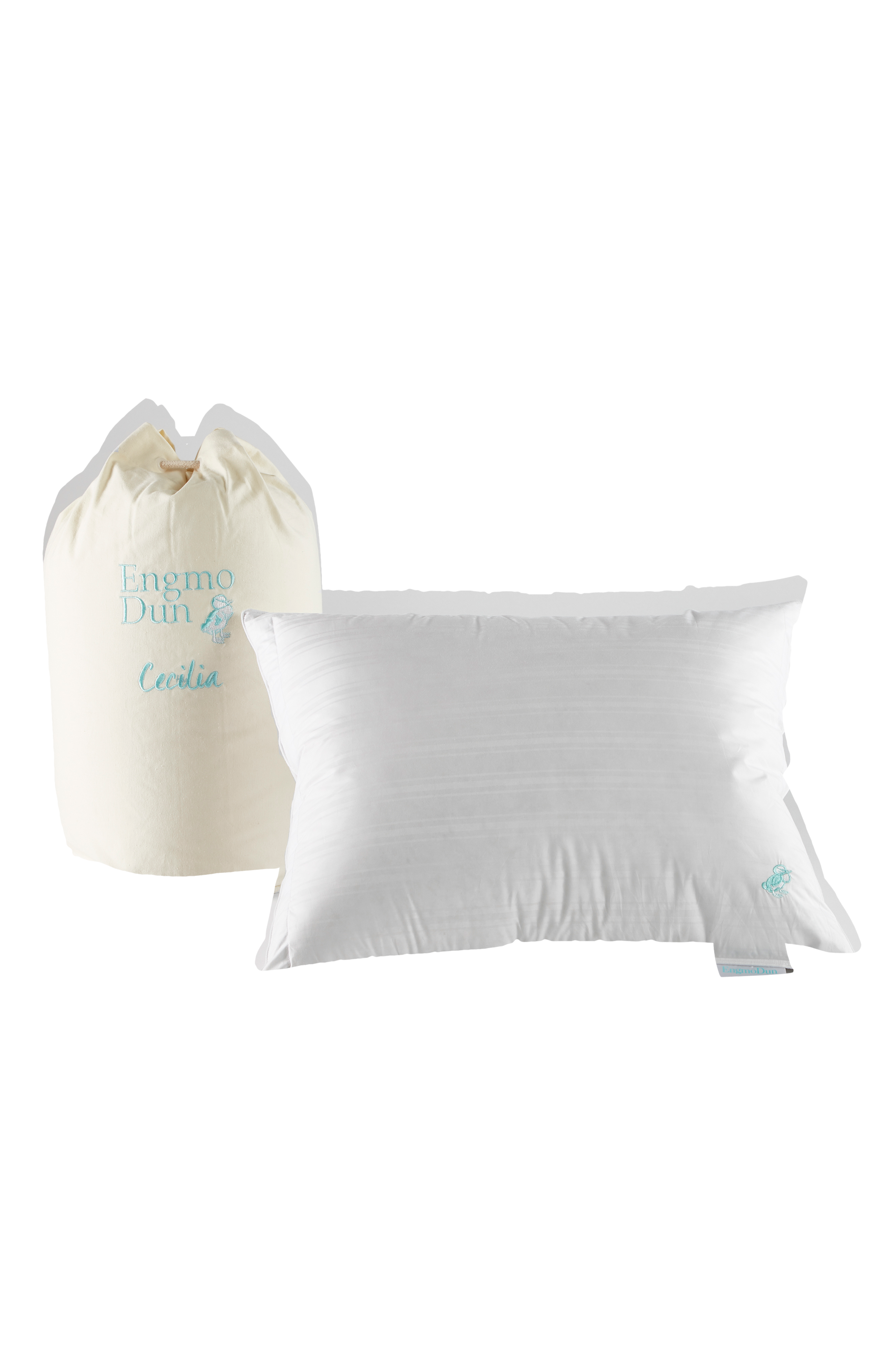 Når skuldrene synker ned på madrassen om aftenen er Cecilia en blød støtte for dit hoved. Med en mere fast midte og blødere dun rundt om hviler du altid skønt. Vi sover forskelligt og har derfor brug for forskellig støtte. Hvis du ofte ligger på siden, giver denne pude den rigtige støtte. 90% europæiske hvid moskusdun (yderst), 30% europæiske hvide moskusdun (inderst). Bæreevne 10 / 7 (yderst/inderst). Blødt, tæt stof i fineste bomuldscambric/twill. Farve: Hvidstribet overside/Hvid underside. Paspolering i hvid, broderi i lys turkis. 100+650 g. Størrelse 50x60