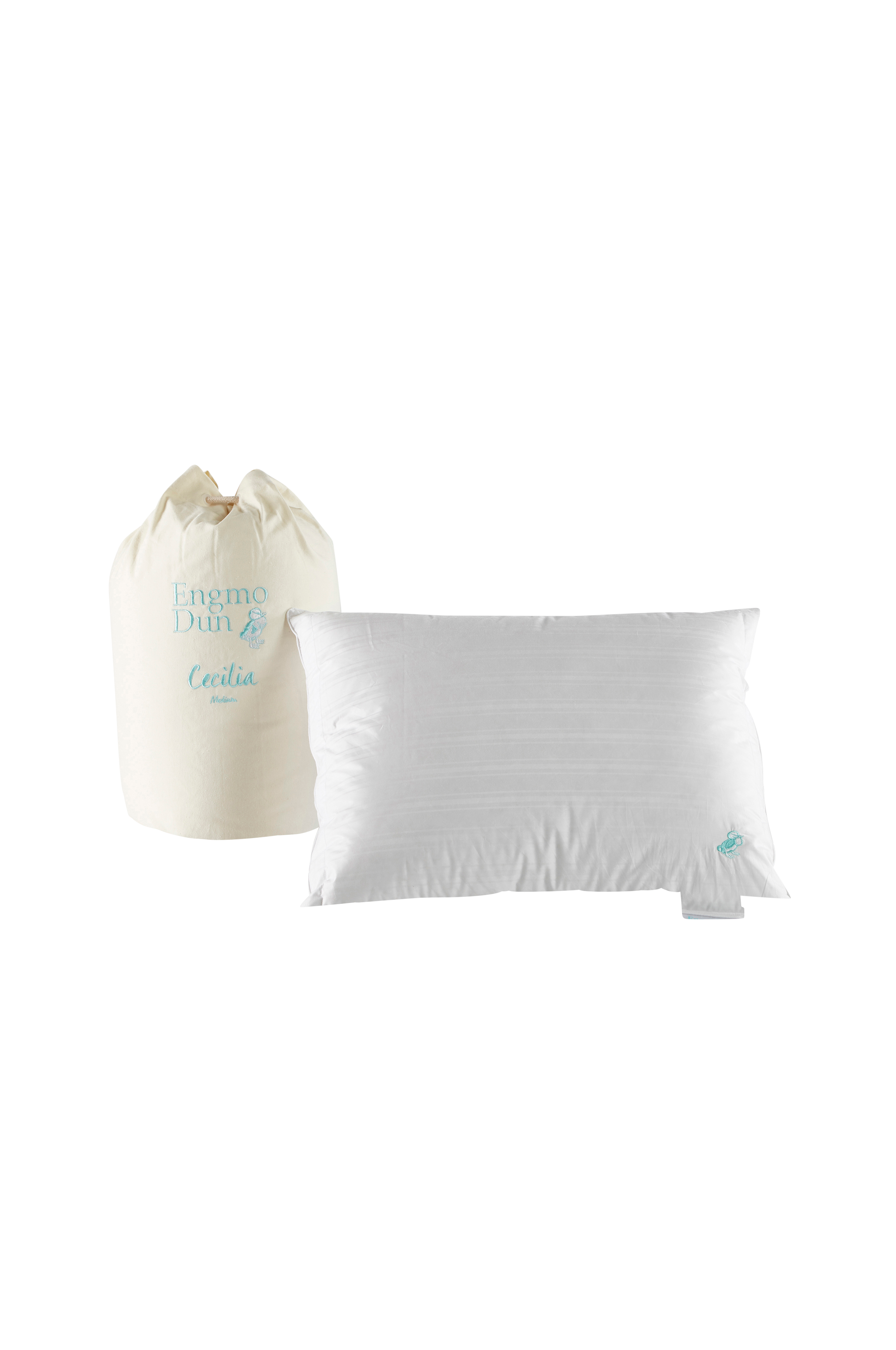 Når skuldrene synker ned på madrassen om aftenen er Cecilia en blød støtte for dit hoved. Med en mere fast midte og blødere dun rundt om hviler du altid skønt. Vi sover forskelligt og har derfor brug for forskellig støtte. Hvis du ofte ligger på siden eller ryggen er dette en pude for dig. 90% europæiske hvid moskusdun (yderst), 30% europæiske hvide moskusdun (inderst). Bæreevne 10 / 7 (yderst/inderst). Blødt, tæt stof i fineste bomuldscambric/twill. Farve: Hvidstribet overside/Hvid underside. Paspolering i hvid, broderi i lys turkis. 100+500 g. Str. 50x60 cm.