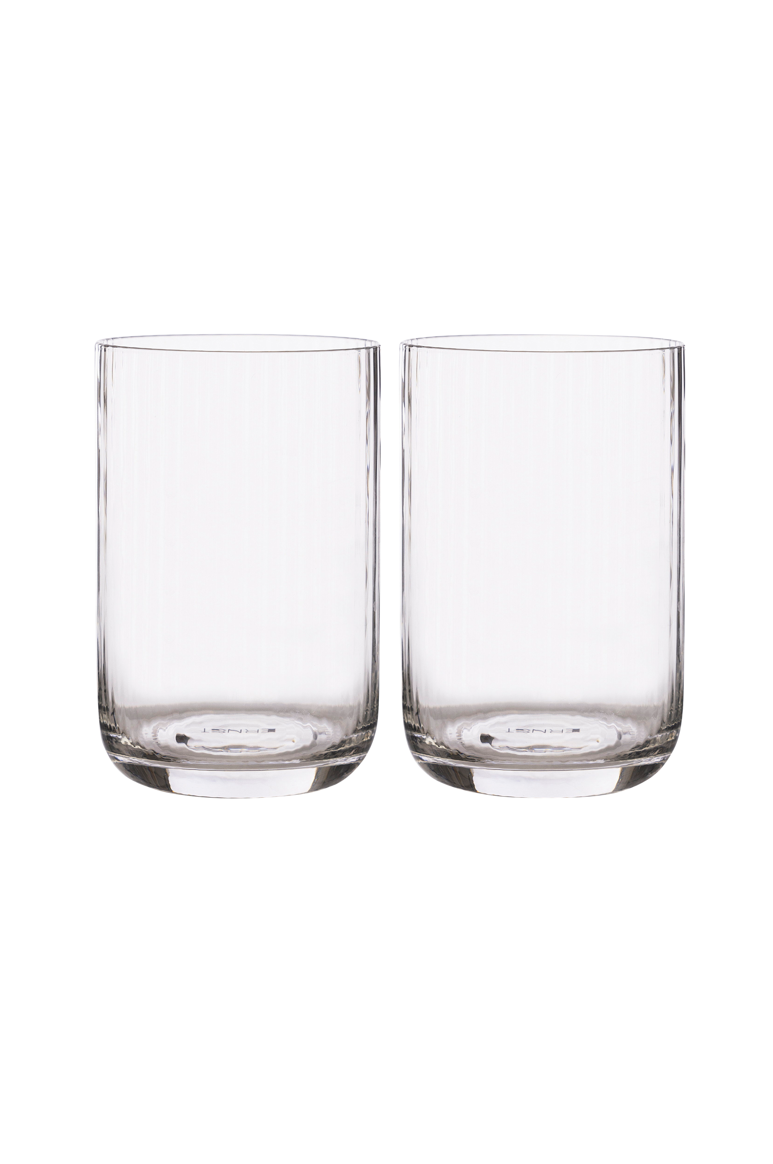 ERNST rillede glas indgår i en serie med flere forskellige glas til forskellige lejligheder. Der findes en kande i samme serie. Elegante at dække op med og gode at drikke af. Mål: diameter 8 cm, højde 12 cm. Tåler opvaskemaskine.
