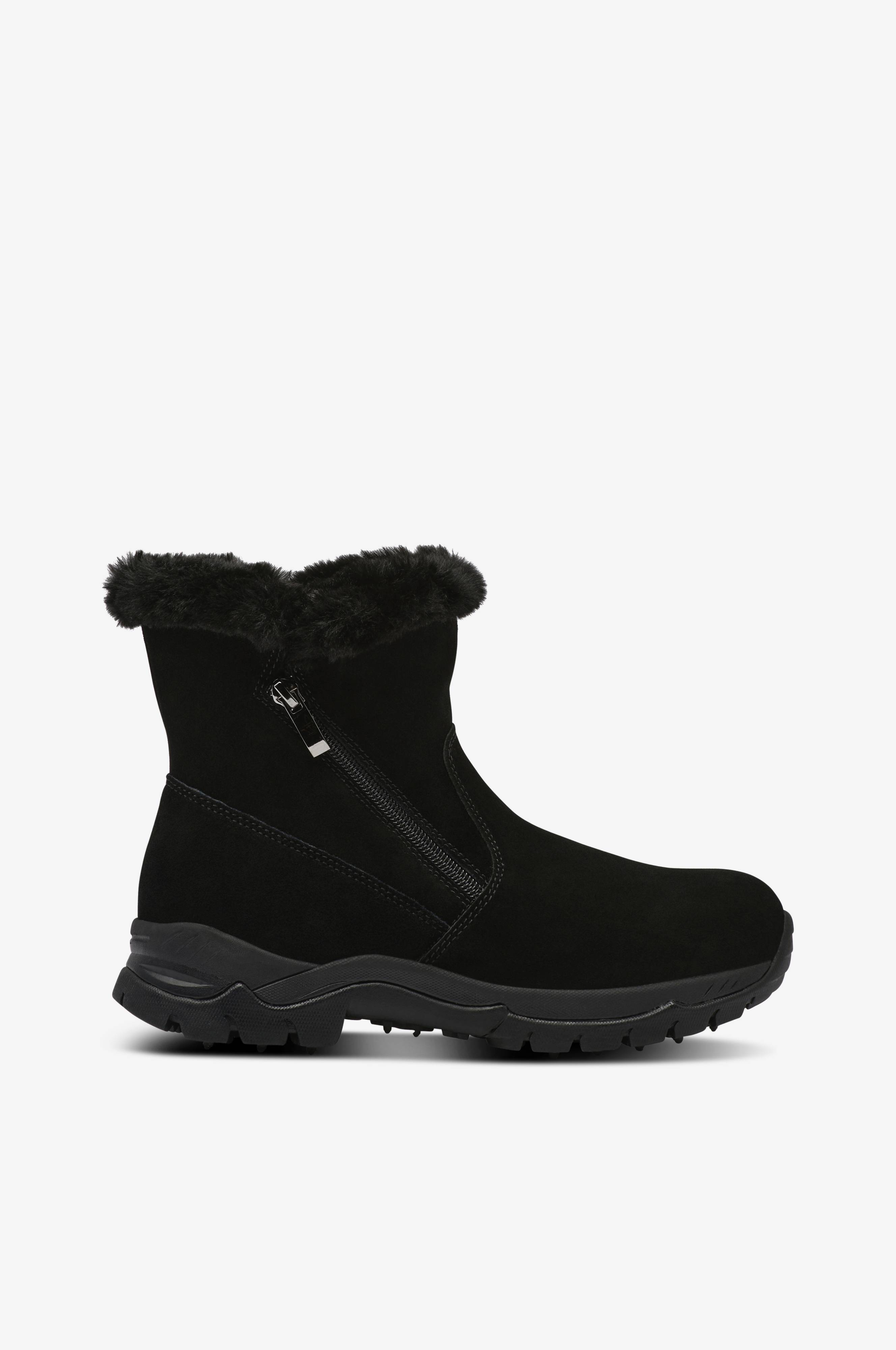 • Boots i ruskind med varm foring i kunstskind• Lynlåse på begge sider af skaftet• Ydersål i gummi• Ydersålen har 15 tungsten-knopper (hårdmetal) og 19 gummiknopper til glatte og isede forhold.• Skafthøjde: 14 cm i str. 37